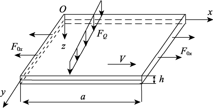 为单位阶跃函数。叠层板板厚为h,密度为ρ,长为a,F0x为轴向拉力。建立空间直角坐标系,Oxy为板的中面,z轴为法向。