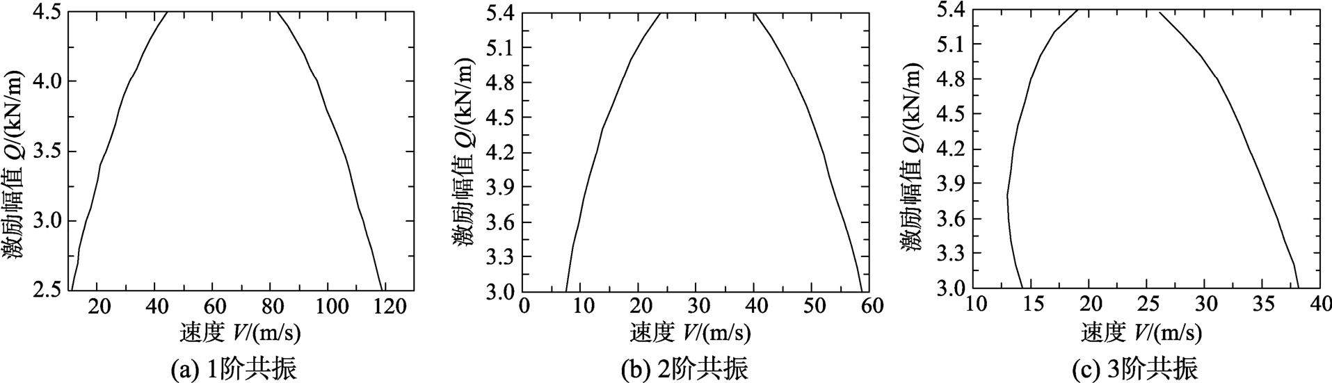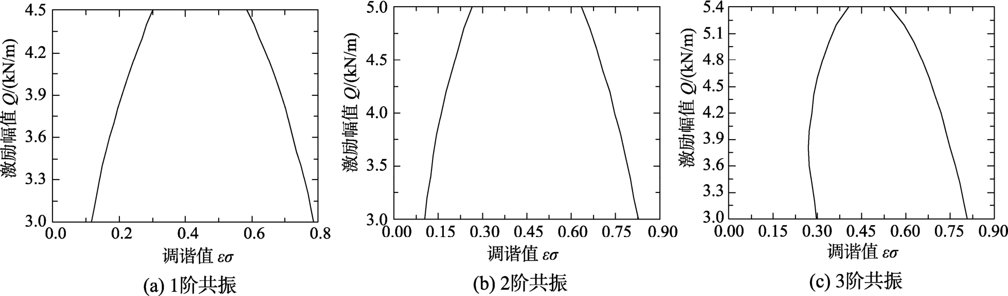 图5给出了与图4相对应的激发共振双值解临界点变化曲线。可以看出,调谐值、激励幅值取特定值时才会激发共振,产生非零解的共振振幅。图5中曲线中间部分为共振区域,曲线两侧为非共振区域;且随着激励幅值和调谐值的变化,激发共振的临界点也随之改变。同时可以看出,1阶、2阶左侧激发共振双值解的临界点随着激励幅值增大,调谐值在增大;右侧激发共振双值解的临界点随着激励幅值增大,调谐值在减小;3阶共振情形时,右侧激发共振的临界点同1阶、2阶共振情形有相似规律。