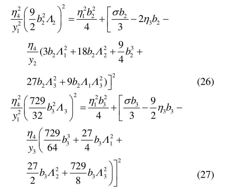 同理,可以得到关于外激励频率满足Ω2=3y2+εσ和Ω3=3y3+εσ的关于幅值b2、b3的幅频响应方程分别为: