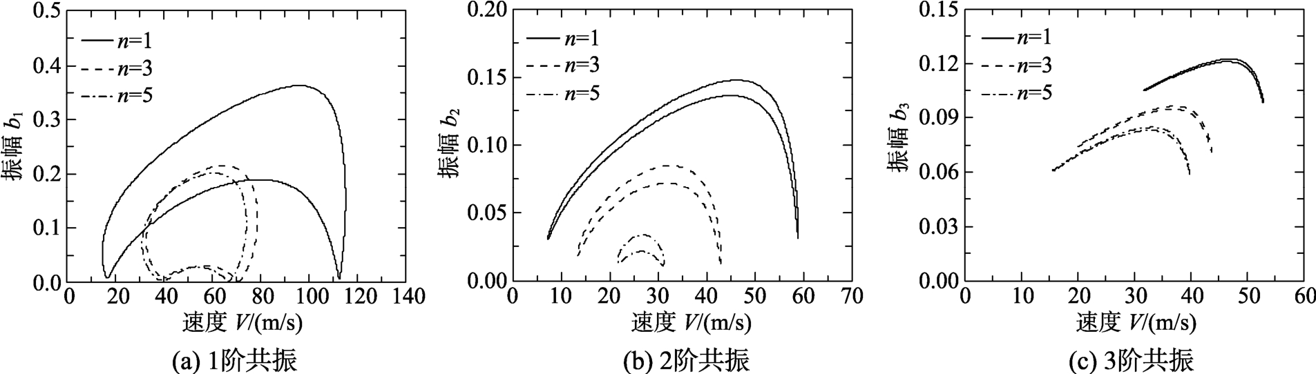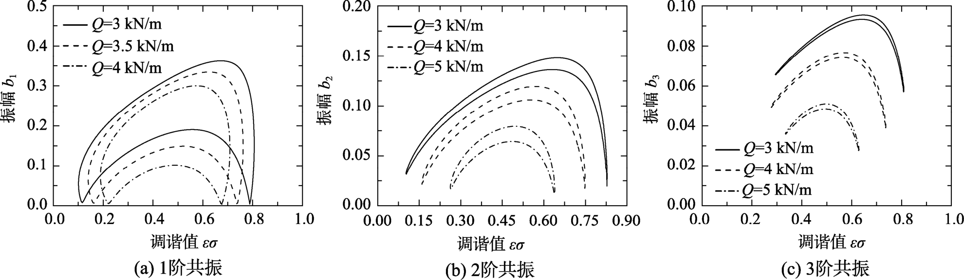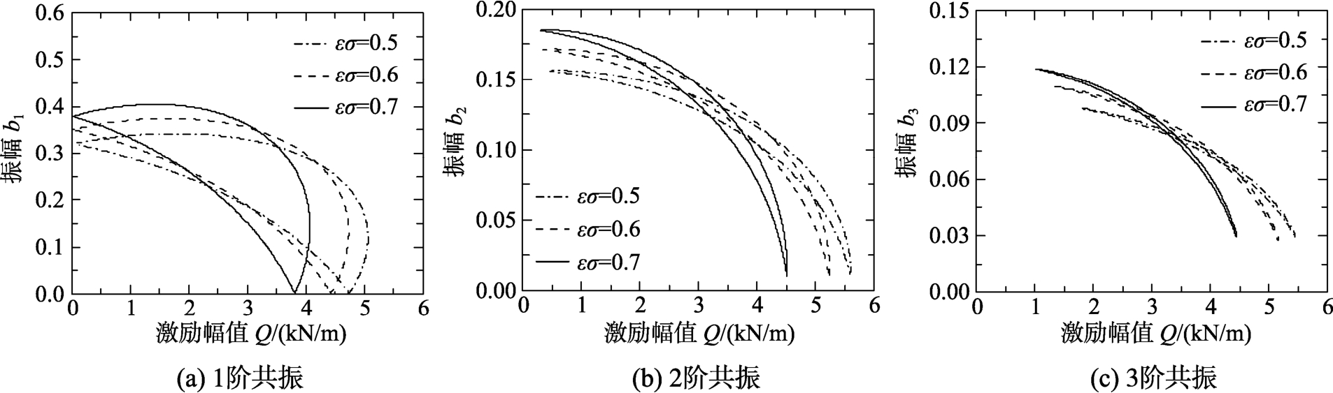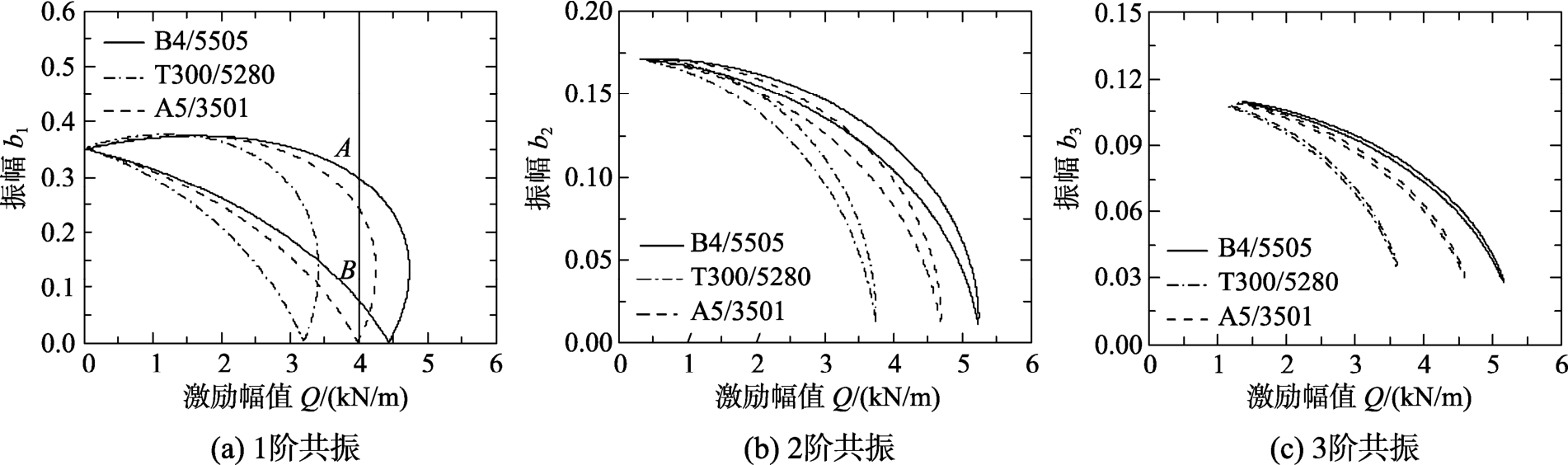 根据一元二次方程根的判别式可判定幅频响应方程非平凡解的存在情况。通过判定可知,式(25)~式(27)均存在两个不相等的实根,即系统的1阶、2阶和3阶共振情形均能被激发。
