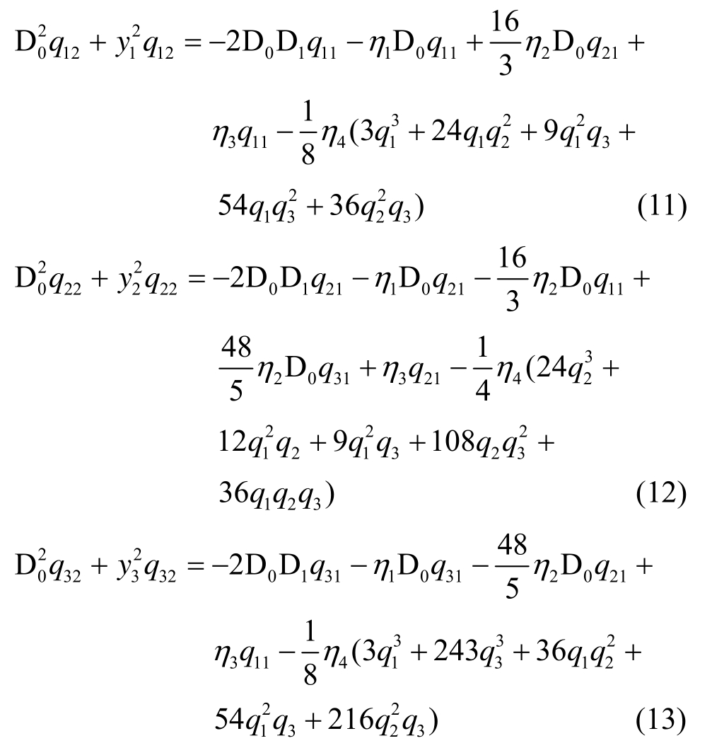 下面运用多尺度法求解外激励频率满足Ω1≈3y1、Ω2≈3y2和Ω3≈3y3的1阶、2阶和3阶不同共振情形的亚谐波共振问题。