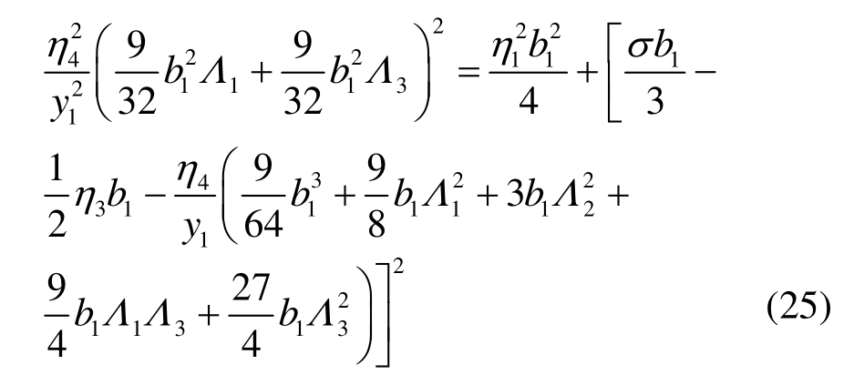 下面首先考虑外激励力频率满足Ω1≈3y1的亚谐波共振。引入调谐参数σ,并令Ω1=3y1+εσ。由此分析知,速度V与调谐值εσ为线性关系,即通过改变速度可以改变激励频率。将式(14)代入式(11)~式(13)中,为避免久期项,可以得到关于Bj满足的关系式: