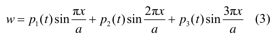正交各向异性叠层条形板的边界条件为对边简支(x=0,a),考虑三阶模态,则位移函数取为: