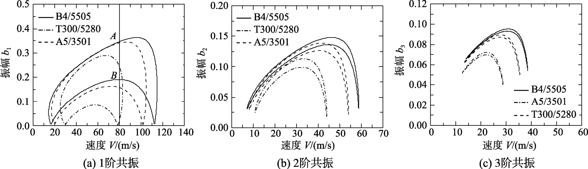 图6~图8分别给出了与图2~图4相对应的不同材料、层数、激励幅值的1阶、2阶、3阶共振情形下的振幅-速度特性曲线图。由图6~图8可以同样看出,所有曲线均为封闭月牙形双值曲线,且分为上支曲线和下支曲线,因此同一激励频率对应于振幅的两个不同值;1阶共振系统情形时,共振最明显,振幅较大,2阶、3阶振幅则越来越小;不同系统参数对于共振有显著影响。由图6可以看出不同材料可以影响振幅的大小。由图7可以看出,在相同板厚的情况下随着层数的增加,曲线整体下移。由图8可以看出,在一定范围内,随着激励幅值的增加,曲线整体下移。由于速度V与调谐值εσ为线性关系,且速度V与调谐值εσ的关系式中y1、y2、y3含有材料、板厚、层数这三个参量,不包含参量激励幅值Q,可以得出图6~图7中振幅值不完全对应图2~图3曲线振幅值,而图8完全对应于图4中振幅值。同样,以图6(a)为例进行稳定性分析,取A、B两点值进行判定可知,A点为对应判别值大于零的稳定解,即该点处于稳定性吸引域中,而B点为不稳定解。