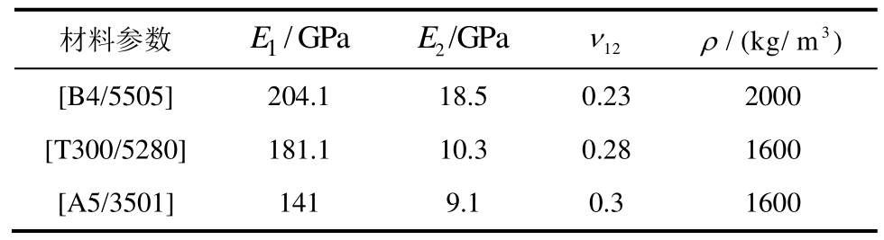 材料参数 E1/GPaE2/GPa ν12 /(kg/m3)ρ[B4/5505]204.1 18.5 0.23 2000[T300/5280]181.1 10.3 0.28 1600[A5/3501]141 9.1 0.3 1600