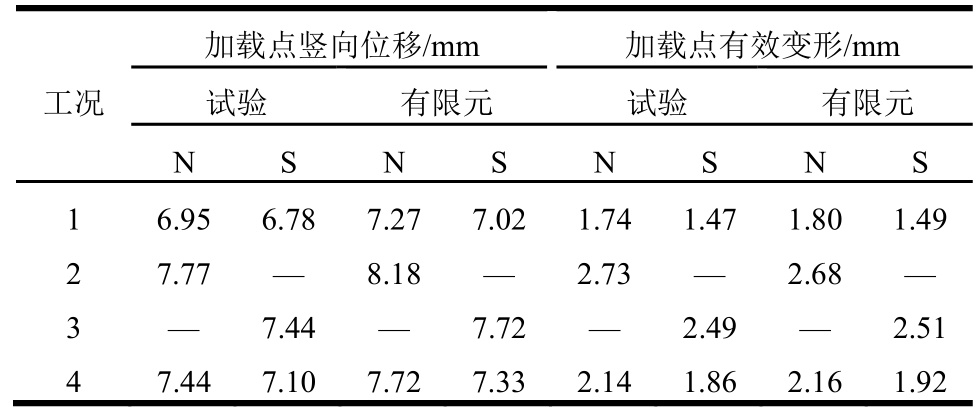 加载点竖向位移/mm 加载点有效变形/mm工况试验 有限元 试验 有限元N S N S N S N S 1 6.956.787.277.02 1.74 1.47 1.801.49 2 7.77— 8.18— 2.73 — 2.68—3 — 7.44— 7.72 — 2.49 — 2.51 4 7.447.107.727.33 2.14 1.86 2.161.92
