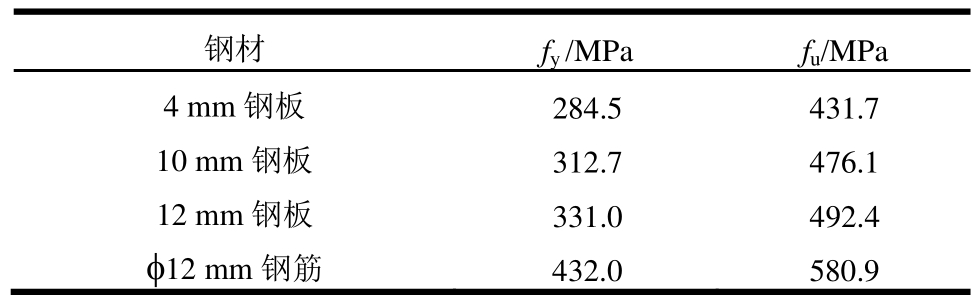 钢材 fy /MPa fu/MPa 4 mm钢板 284.5 431.7 10 mm钢板 312.7 476.1 12 mm钢板 331.0 492.4 φ12 mm钢筋 432.0 580.9