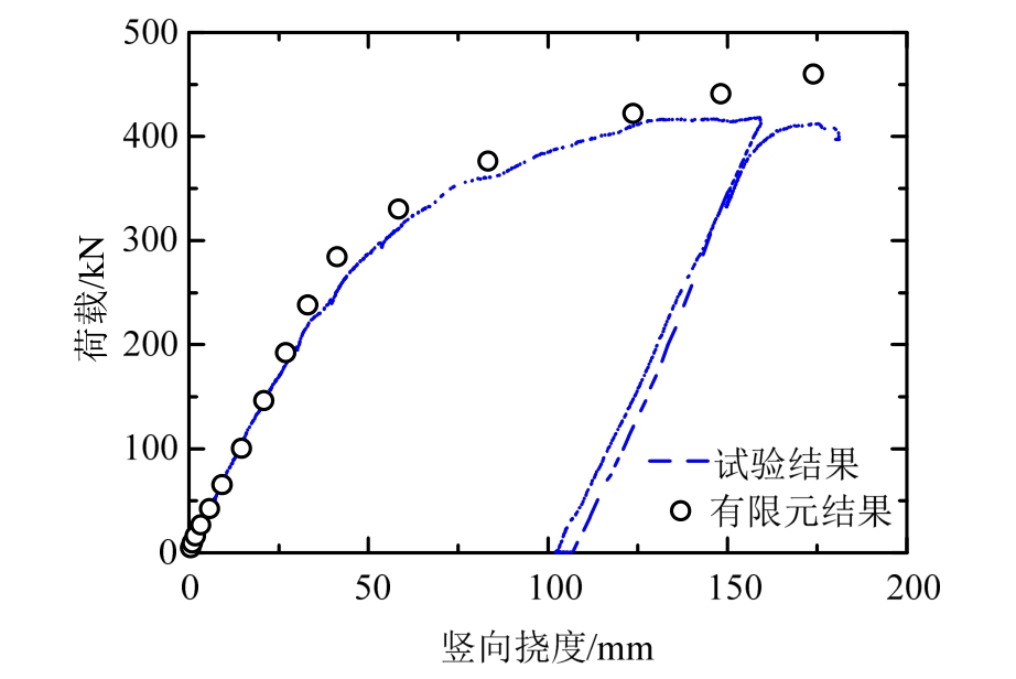 表4为弹性工况下构件加载点变形的对比结果,有限元计算的竖向位移及有效变形结果与试验结果吻合良好,计算平均误差为2%以内。在竖向位移对比中,有限元结果略高于试验结果,这可能是吊杆刚度的数据在试验量测中偏小所致。而对于实际变形,有限元结果与试验结果吻合精度高,验证了有限元模型的有效性。