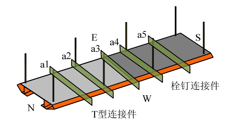 在吊装过程中,按照预先计算的各吊杆分布力情况调整吊杆内力;吊杆自身安装调整装置,其吊杆内力通过设置在吊杆顶端的力传感器传输到电脑进行调整。吊杆和桥面系的连接采用插入扣装置;竖向传力板由桥面系底部贯穿伸出并在顶部留有孔洞,吊杆底部伸出装置亦留出孔洞,通过钢块插入两者共同的孔洞完成传力连接,见图6。