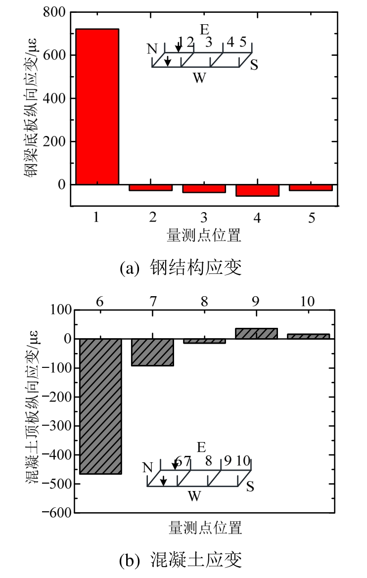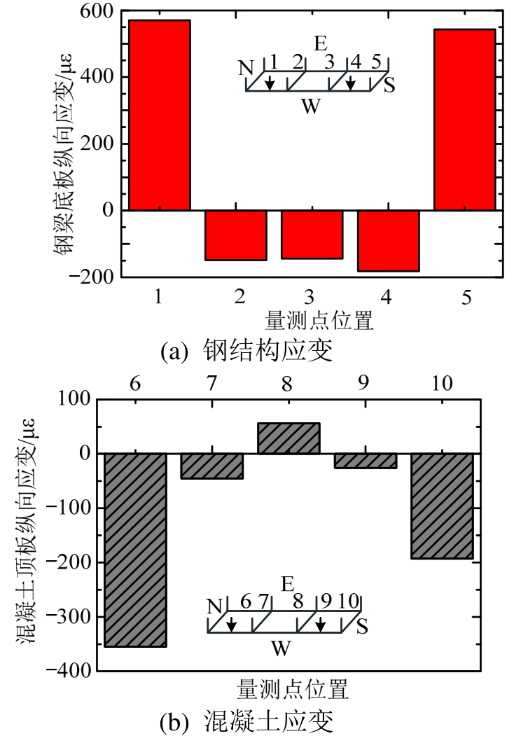 工况2为北侧加载,工况3为南侧加载,两种工况的应变结果呈现出相似的规律。以工况2结果为例,图13为关键点应变的分布图,可以看出钢结构应变呈现由北向南逐渐减小的趋势,在位置4处降低到最大值;混凝土应变由压应变向南逐步变为拉应变,在位置9处达到最大值。该现象与传统连续梁有明显不同,连续梁会在相邻跨产生正、负弯矩的转换,但该试验中在接近隔一跨位置正弯矩才逐渐转换为负弯矩,原因为试验中构件是进行悬吊加载,而吊杆有一定的竖向刚度,此为真实悬索桥桥面系内力状态与连续梁内力状态的差异。通过采用悬吊试验的方式将这一特征展现,更接近悬索桥桥面系实际受力状态,是本试验的一个亮点。