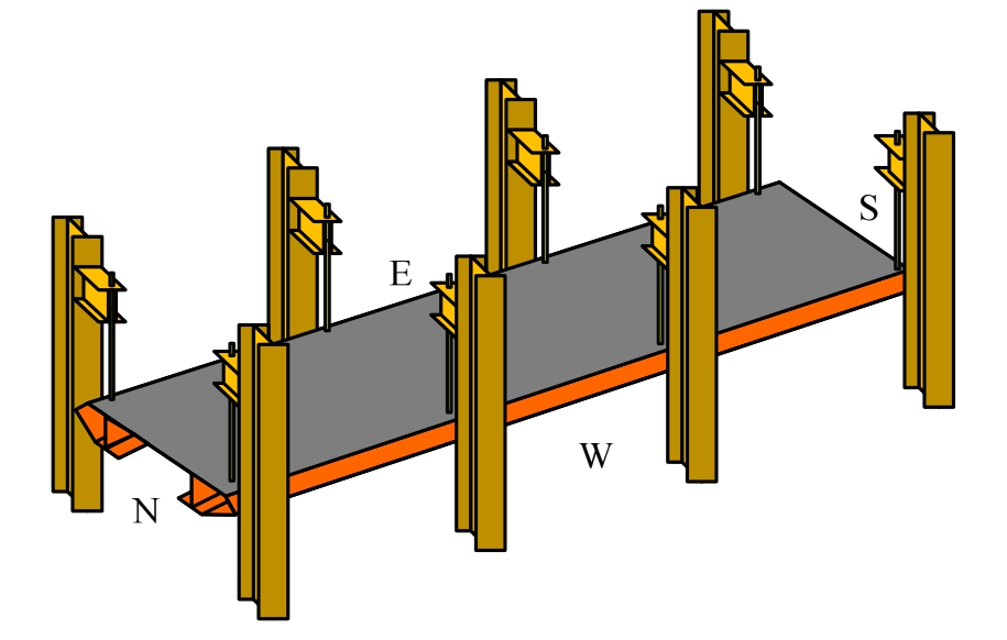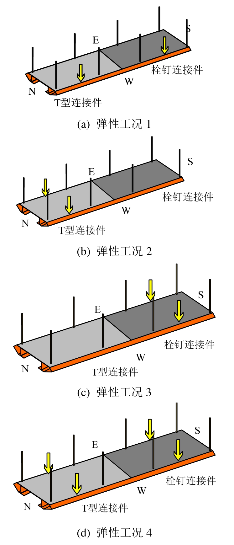 弹性工况的加载方案见图7,采用千斤顶对相应跨的跨中进行加载。弹性阶段采用4个工况,分别为工况1:西侧(W)加载;工况2:北侧(N)加载;工况3:南侧(S)加载;工况4:南北侧(SN)加载。弹性工况加载时各千斤顶加载至30 t停止加载。