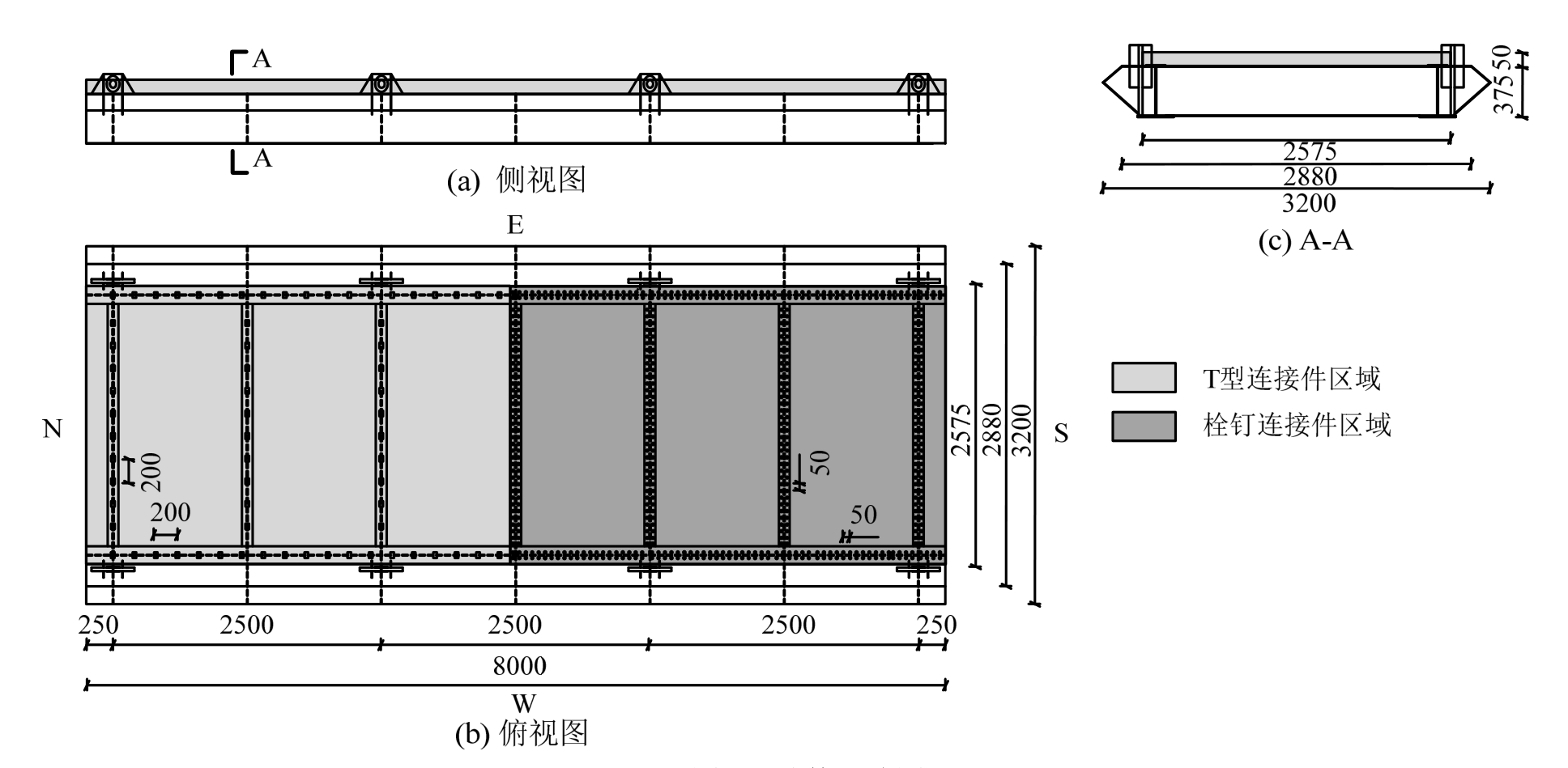 试件采用双工字型组合截面,缩尺后试件长度为8.0 m、宽度为4.0 m、高度为0.425 m,其中钢梁高0.375 m,混凝土板厚50 mm;工字钢截面的上翼缘、腹板、下翼缘截面尺寸分别为160 mm×10 mm、353 mm×12 mm、300 mm×12 mm。构件共3跨,每跨2.5 m,此外在边跨吊点处各外延0.25 m;每个吊点处设置连接装置,用于吊杆和桥面系的连接。试件设计尺寸可参见图1。