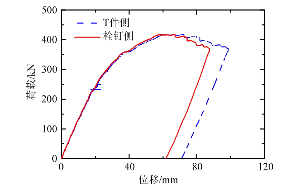 图17 T件侧与栓钉侧荷载-位移曲线对比