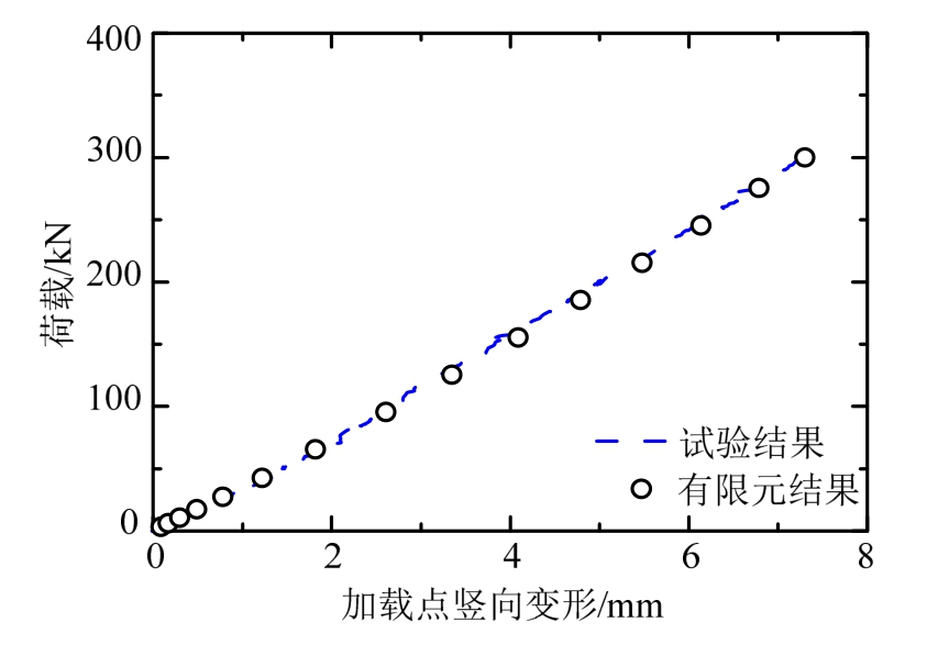 有限元采用与试验相同的加载方式进行扭转工况加载,荷载施加在西侧中跨跨中位置。将有限元计算得到的加载点荷载-位移曲线与试验曲线进行对比,如图20所示。在300 kN集中荷载作用下,有限元算得到的加载点挠度为7.30 mm,与试验结果误差为0.1%。