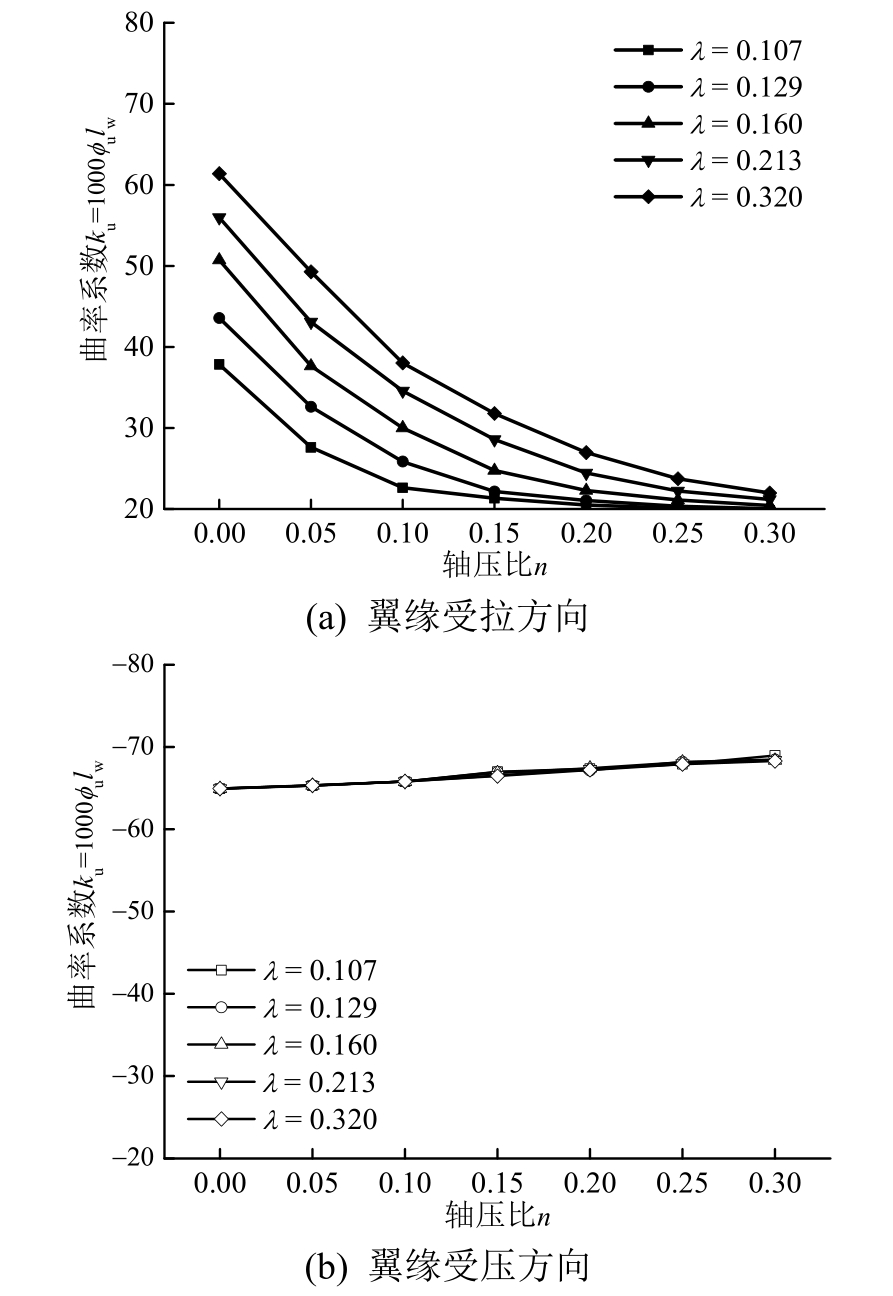 沿用1.2节的弯矩-曲率分析方法,按照表1的参数取值对带翼缘剪力墙进行非线性截面分析。为了便于研究,同样引入无量纲极限曲率系数ku:
