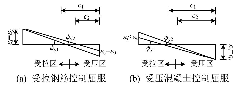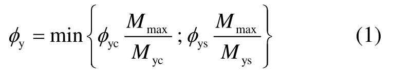 式中:φyc和Myc分别为非约束混凝土达到峰值应变ε0时对应的曲率和弯矩;φys和Mys分别为纵筋达到屈服应变εy时对应的曲率和弯矩。在低轴压时,纵筋通常率先屈服,因此φys作为控制因素;而在高轴压时,特别是对于翼缘受拉方向,受压区边缘混凝土率先达到峰值应变,φyc成为控制因素。