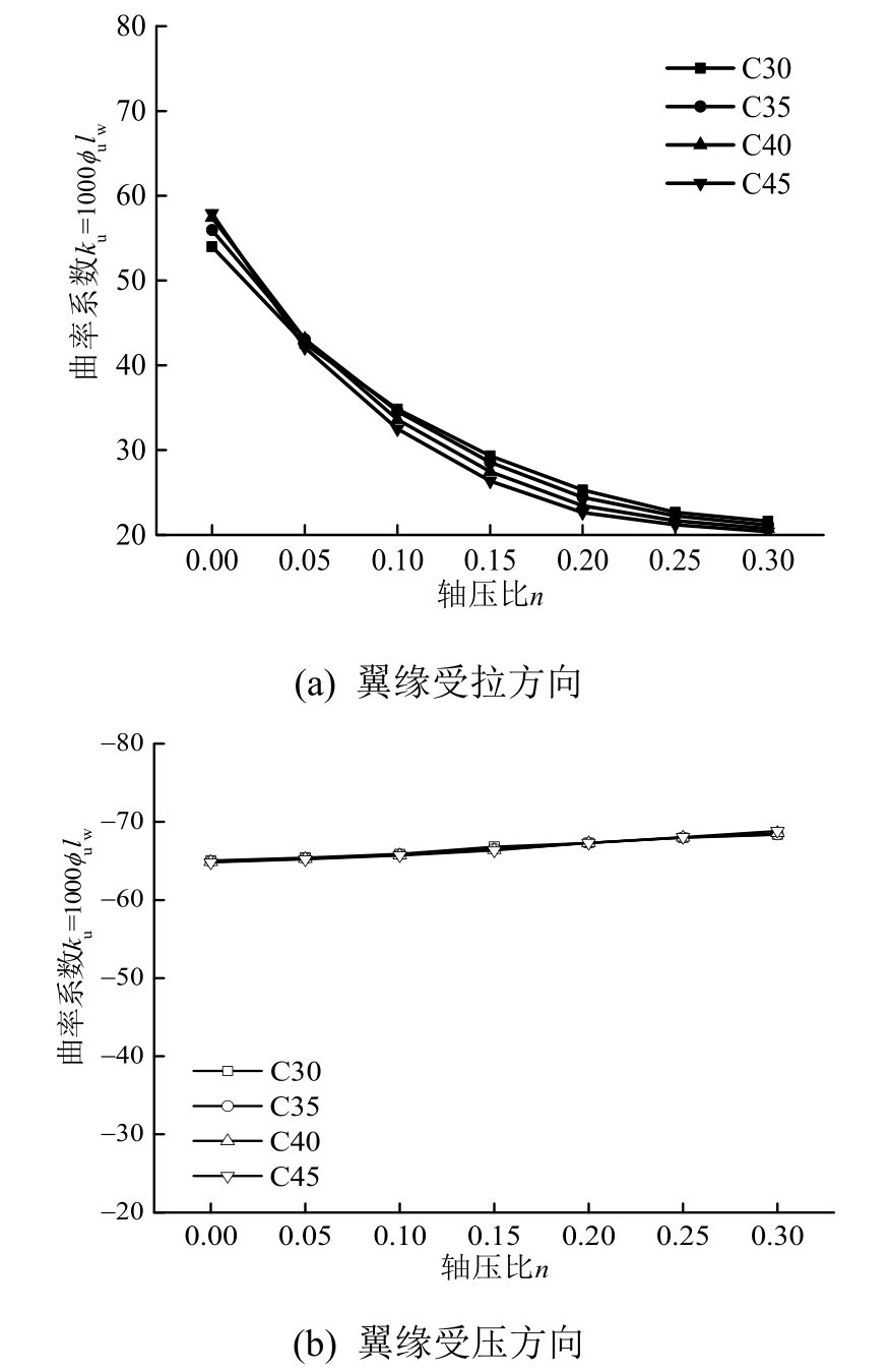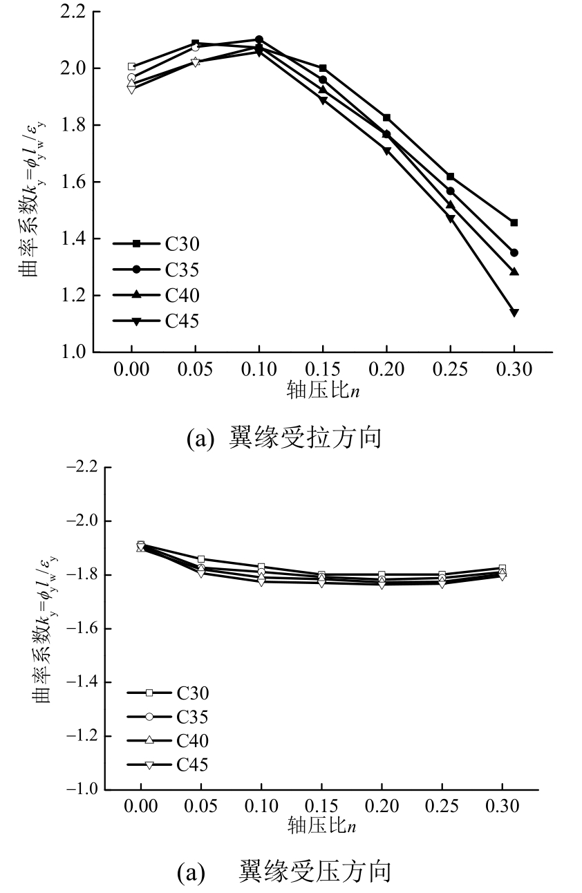 从图7(a)可以看出,对于翼缘受拉方向,无论是受拉钢筋还是受压混凝土控制截面屈服,屈服曲率均随着混凝土强度的增大而减小。分析发现:随着混凝土强度的增大,其在相同应变下可承担的压应力增大,从而减小了截面的受压区高度;但从另一方面看,混凝土强度增大的同时,在相同轴压比下截面承受的轴压力也增大,所以截面的受压区高度又相应增大,但两者哪一个是主要因素还需进一步分析。通过观察截面屈服时的中和轴位置可以发现,当轴压比为0和0.05即受拉钢筋控制截面屈服时,混凝土强度越高受压区高度就越小,因此屈服曲率就越小;而轴压比大于0.05后,受压混凝土控制截面屈服。此时混凝土强度越高受压区高度越大,所以屈服曲率越小。从图7(b)可以看出,对于翼缘受压方向,随着混凝土强度的增大,截面的屈服曲率略有减小,但变化程度有限。