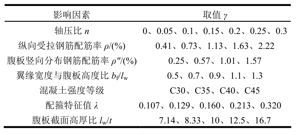 影响因素 取值γ轴压比n 0、0.05、0.1、0.15、0.2、0.25、0.3纵向受拉钢筋配筋率ρ/(%) 0.41、0.73、1.13、1.63、2.22腹板竖向分布钢筋配筋率ρ"/(%)0.25、0.57、1.01、1.57翼缘宽度与腹板高度比bf/lw 0.5、0.7、0.9、1.1、1.3混凝土强度等级 C30、C35、C40、C45配箍特征值λ 0.107、0.129、0.160、0.213、0.320腹板截面高厚比lw/t 7.14、8.33、10、12.5、16.7