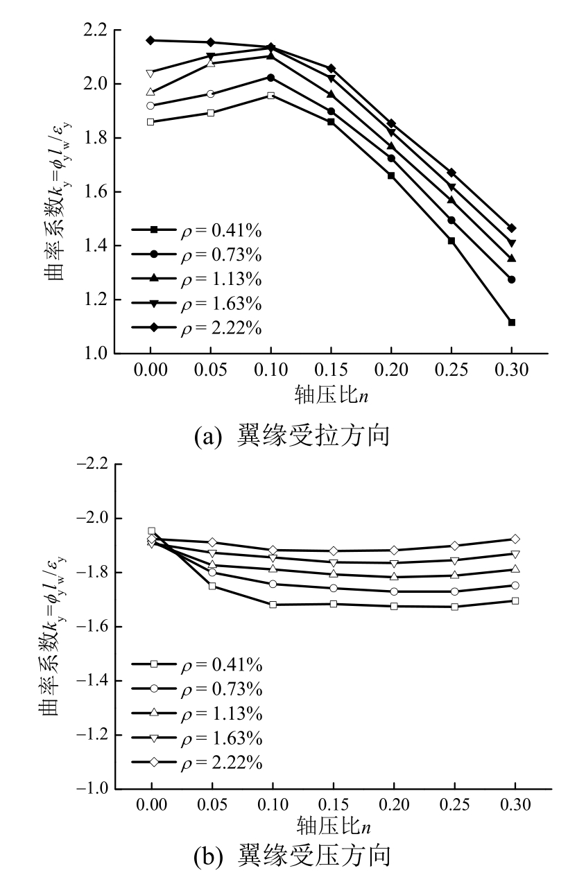 从图5(a)可以看出,对于翼缘受拉方向,无论是受拉钢筋还是受压混凝土控制截面屈服,屈服曲率均随着纵筋配筋率的增大而增大,特别是在轴压比较小时其增大程度更为明显。分析原因发现:纵筋配筋率的增大对截面受拉区和受压区的应力及其合力均有提高,当轴压比较小时,截面受压区高度较小,此时纵筋配筋率的提高对受拉区合力的贡献更大,从而需要更大的受压区高度来平衡拉力。因此在受拉纵筋控制屈服时,屈服曲率随着纵筋配筋率的增大而增大。当轴压比较大时,截面受压区高度较大,此时纵筋配筋率的提高对受压区合力的贡献更大,从而需要更小的受压区高度来平衡拉力。因此在受压混凝土控制屈服时,屈服曲率也随着纵筋配筋率的增大而增大。从图5(b)可以看出,对于翼缘受压方向,屈服曲率随着纵筋配筋率的增大也有明显的增大。这说明纵筋配筋率的提升可有效延缓带翼缘剪力墙的屈服,避免构件过早进入塑性状态。