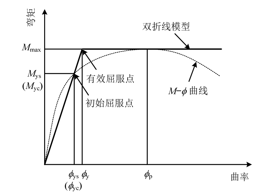 屈服曲率大致有两种定义方式,其中赵花静等[6]和钱稼茹等[8]均以最外侧受拉钢筋屈服时的截面曲率作为屈服曲率,即构件的初始屈服曲率,然而Priestley等[3]提出的有效屈服曲率对于设计更有意义,其定义为由坐标原点经过初始屈服点的直线与通过峰值弯矩点的M-φ曲线切线的交点。通过有效屈服曲率可将M-φ曲线近似为双折线模型,该双折线模型由于其简便性和足够的精确性在设计中得到了广泛的应用。考虑到软化段切线取法具有一定的主观性,本文参考文献[13]采用图1所示的方法来计算有效屈服曲率,即: