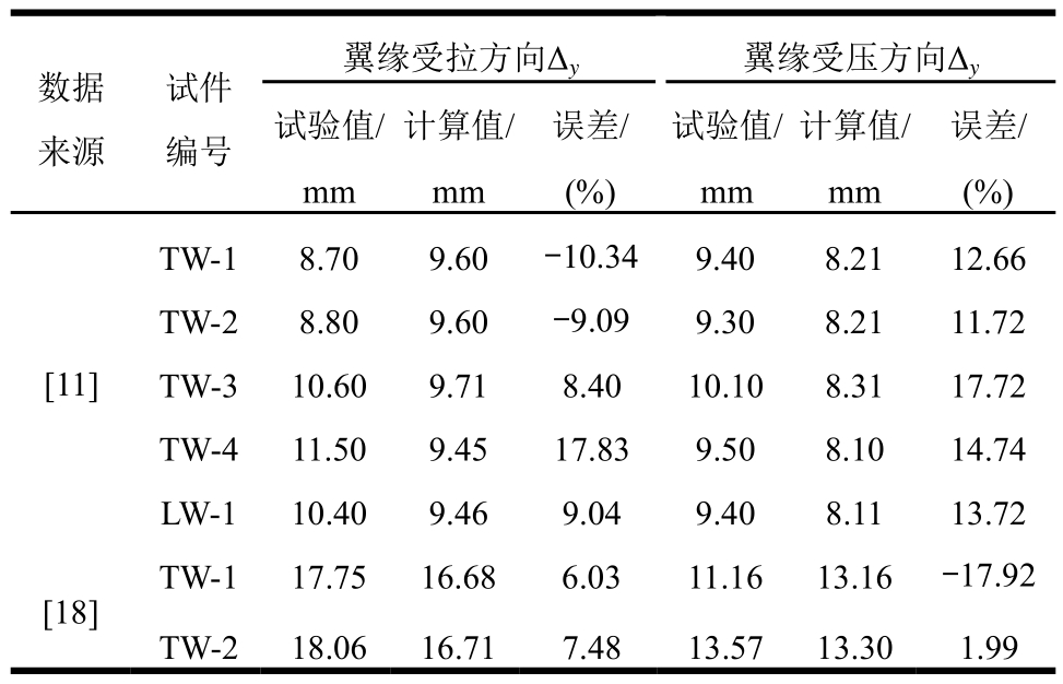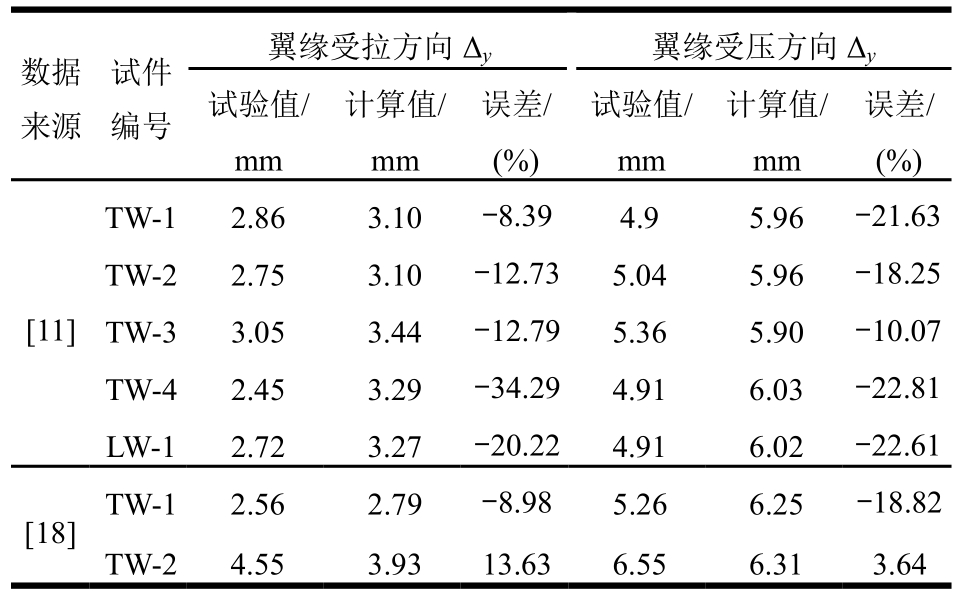 数据来源翼缘受拉方向Δy 翼缘受压方向Δy试件编号 试验值/mm计算值/mm误差/(%)试验值/mm计算值/mm误差/(%)TW-1 8.70 9.60 -10.34 9.40 8.2112.66[11]TW-2 8.80 9.60 -9.09 9.30 8.2111.72 TW-3 10.60 9.71 8.40 10.10 8.3117.72 TW-4 11.50 9.45 17.83 9.50 8.1014.74 LW-1 10.40 9.46 9.04 9.40 8.11 13.72 TW-1 17.75 16.68 6.03 11.16 13.16-17.92[18]TW-2 18.06 16.71 7.48 13.57 13.301.99