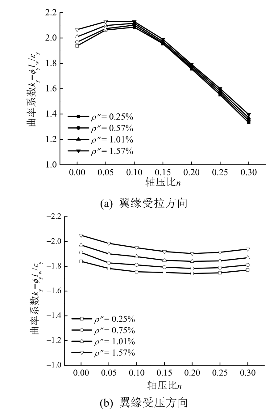从图6(a)可以看出,对于翼缘受拉方向,在轴压比的变化范围内,屈服曲率随着腹板竖向分布钢筋配筋率的增大而增大,但其对屈服曲率的影响程度较小,特别是在受压混凝土作为屈服控制因素后,当ρ''从0.25%增大到1.57%时,屈服曲率的变化不超过5%。从图6(b)可以看出,对于翼缘受压方向,屈服曲率随着腹板竖向分布钢筋配筋率的增大有明显的增大,这是因为,ρ''的增大显著提高了了该方向的受压区高度,从而屈服曲率得以增大。