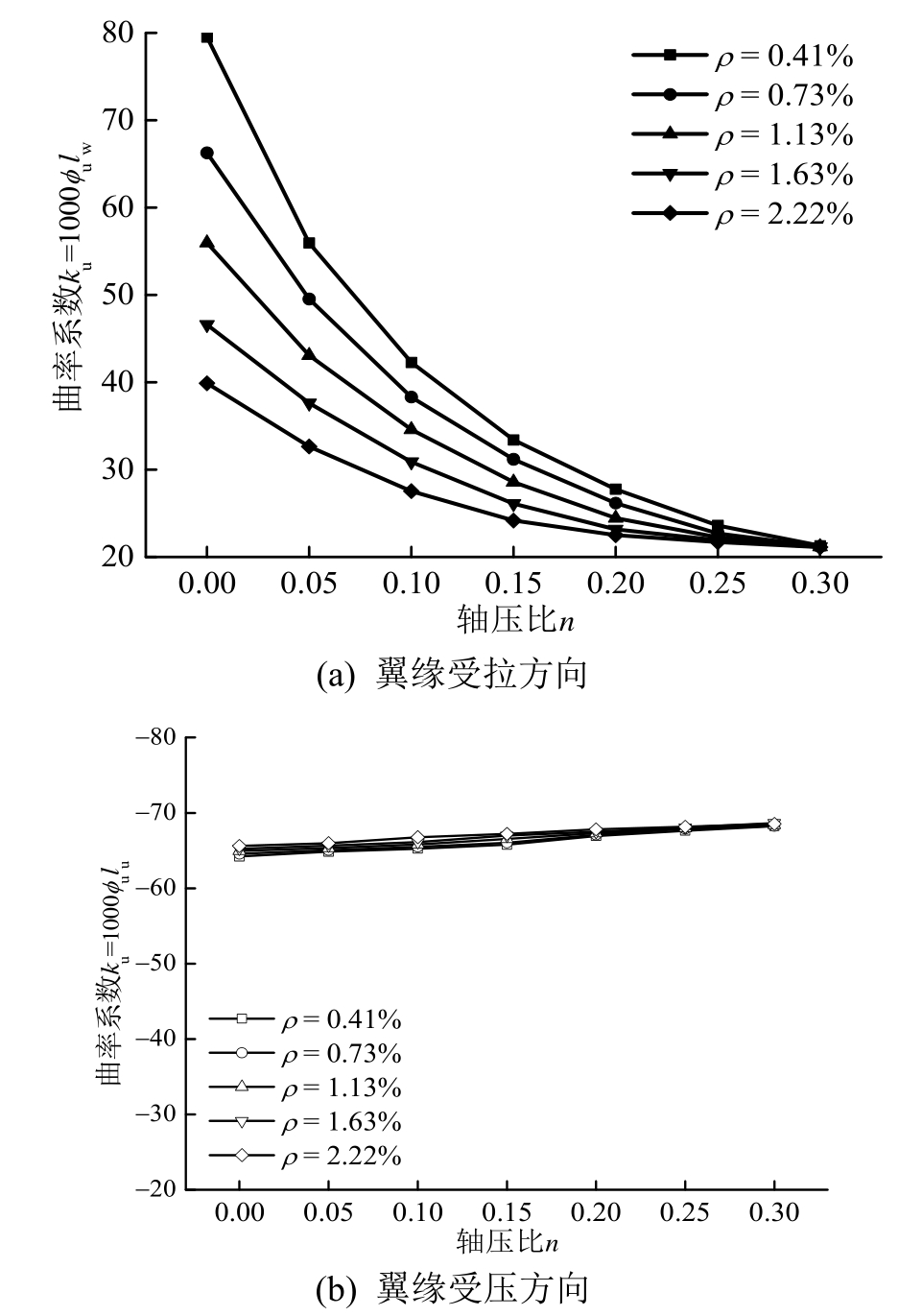 综合图5~图10屈服曲率系数随轴压比的变化关系可以看出,对于翼缘受拉方向,在轴压比较小受拉钢筋作为屈服的控制因素时,屈服曲率随着轴压比的增大而增大。这是因为轴压力的增大使得截面受压区高度得以增加,从而屈服曲率也相应增大。从另一角度看,也是因为增大的轴压力抵消了一部分的钢筋应力,从而延缓了截面的屈服。当轴压比较大受压混凝土成为屈服的控制因素后,屈服曲率随着轴压比的增大而减小,这同样归因于截面受压区高度的增大,加剧了混凝土应变的增大。对于翼缘受压方向,总体来看屈服曲率随轴压比的增大变化不明显。分析是因为翼缘受压方向截面的屈服始终是由受拉钢筋控制的,同时由于翼缘面积较大,轴压力的增大对受压区高度的提升贡献不大,因此屈服曲率也变化不大。