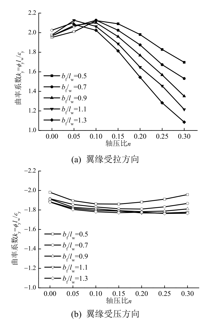 从图8(a)可以看出,对于翼缘受拉方向,在轴压比较小受拉钢筋作为屈服的控制因素时,屈服曲率随着翼缘宽度与腹板高度比的增大而增大,而当轴压比较大受压混凝土成为屈服的控制因素后,屈服曲率随着翼缘宽度与腹板高度比的增大而减小,这是由于翼缘宽度的增大迫使截面受压区高度增大导致的。从图8(b)可以看出,对于翼缘受压方向,随着翼缘宽度与腹板高度比的增大,屈服曲率略有减小,但变化程度也较小。