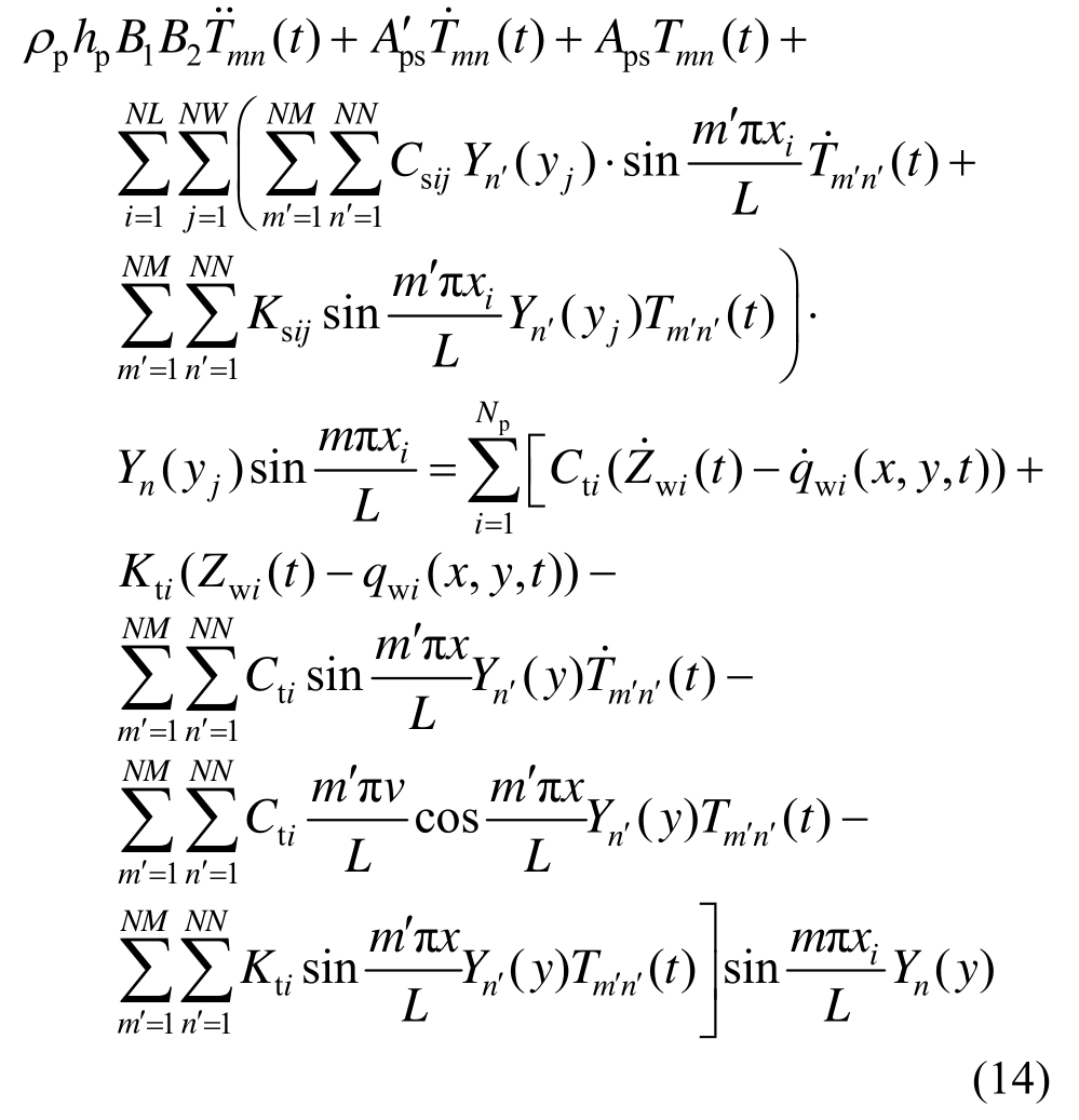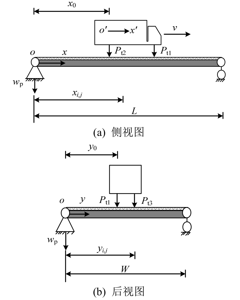 式中:Np为作用在钢桥面沥青铺装层上荷载的数量;NL、NW分别为x、y向离散支点数;Pti为车辆荷载对桥面的垂向作用力,![]()