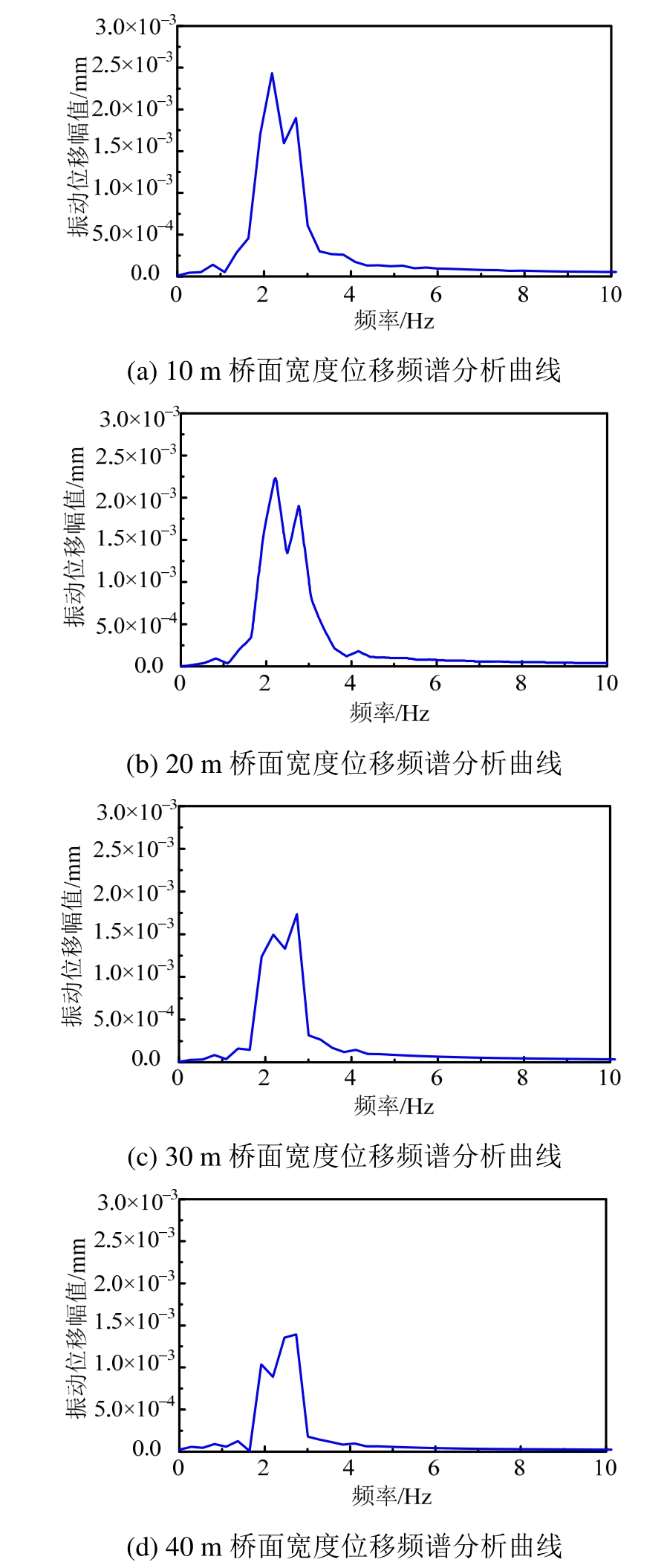 同时,当桥面宽度分别为10 m、20 m、30 m及40 m时,铺装层表面位移峰值时程曲线的一阶优势频率分别为2.21 Hz、2.22 Hz、2.76 Hz及2.76 Hz,如图11所示。说明桥面宽度与桥梁一阶自振频率的变化趋势相同。