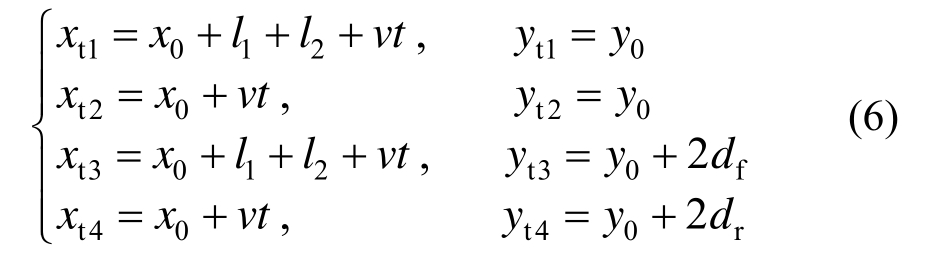 式中:x0为初始时刻后轴距原点的水平距离;y0为初始时刻后轴左侧轮胎距原点的水平距离;df和dr分别为前轴和中、后轴的轮距的1/2。