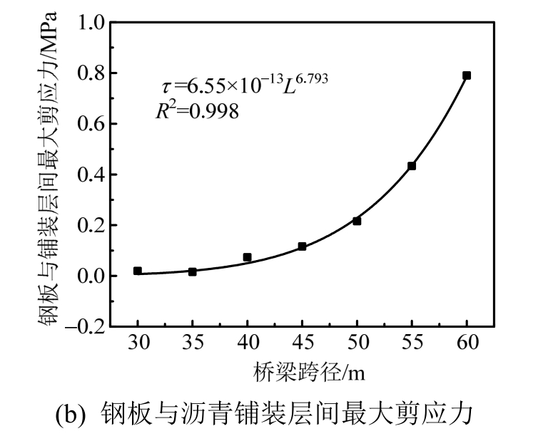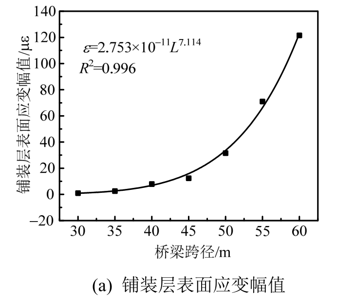 图8(a)为桥梁跨径对铺装层表面应变幅值的影响。由图8(a)可见,随着桥梁跨径的不断增大,铺装层表面应变幅值呈现出增大的趋势,且呈幂函数规律进行变化。随着桥梁跨径的不断增大,铺装层表面应变幅值由0.916 με增加至121.514 με,增大幅度高达132倍。图8(b)为桥梁跨径对钢板与沥青铺装层间最大剪应力的影响。由图8(b)可见,当桥梁跨径从30 m增大到60 m时,钢板与铺装层间的最大剪应力同样呈幂函数趋势增加,由0.0195 MPa增大至0.79 MPa,增大了40倍,可见桥梁跨径对钢桥面沥青铺装层的动力响应影响非常之大。