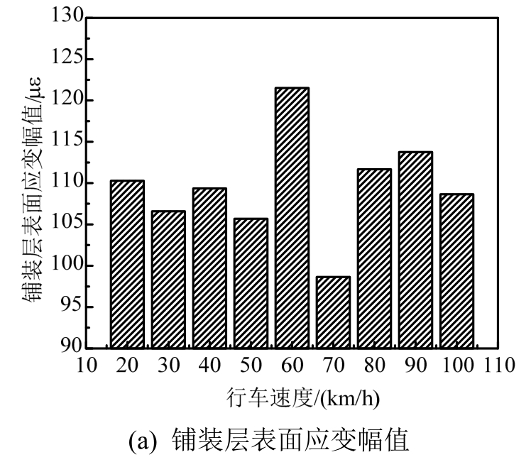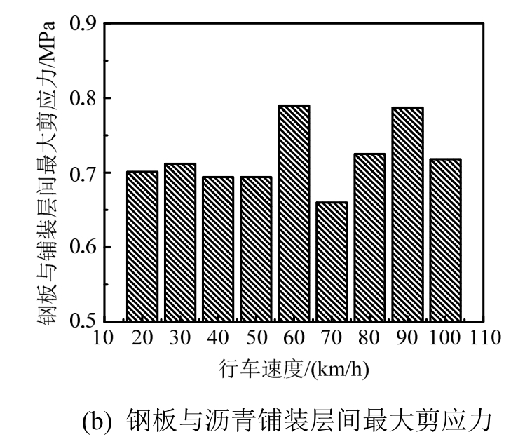 可以看出,行车速度对铺装层表面应变幅值及铺装层和钢板间最大剪应力的影响较为复杂。随着行车速度的增大,两者的数值不断上下波动。但在车速为60 km/h时两者数值均达到最大,70 km/h时数值均达到最小。同时除这两个行车速度以外,当车辆以其他速度行驶时,两种动力响应在数值上相差较小,尤其在20 km/h~50 km/h的低速区间行驶时,基本可忽略行车速度带来的影响。并且当车辆以高于80 km/h的速度行驶时,两种动力响应的变化规律基本相同。