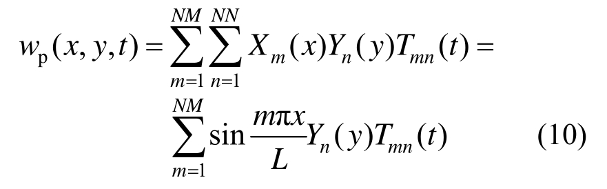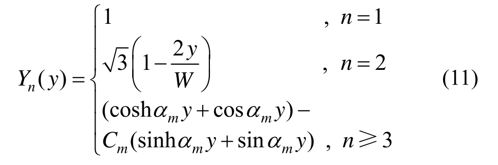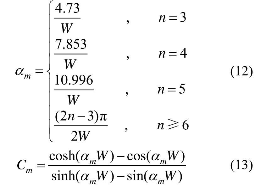 式中:Tmn为正则坐标;NM、NN分别为x、y方向模态阶数;αm为频率系数,由式(12)计算;Cm为函数系数,由式(13)计算。