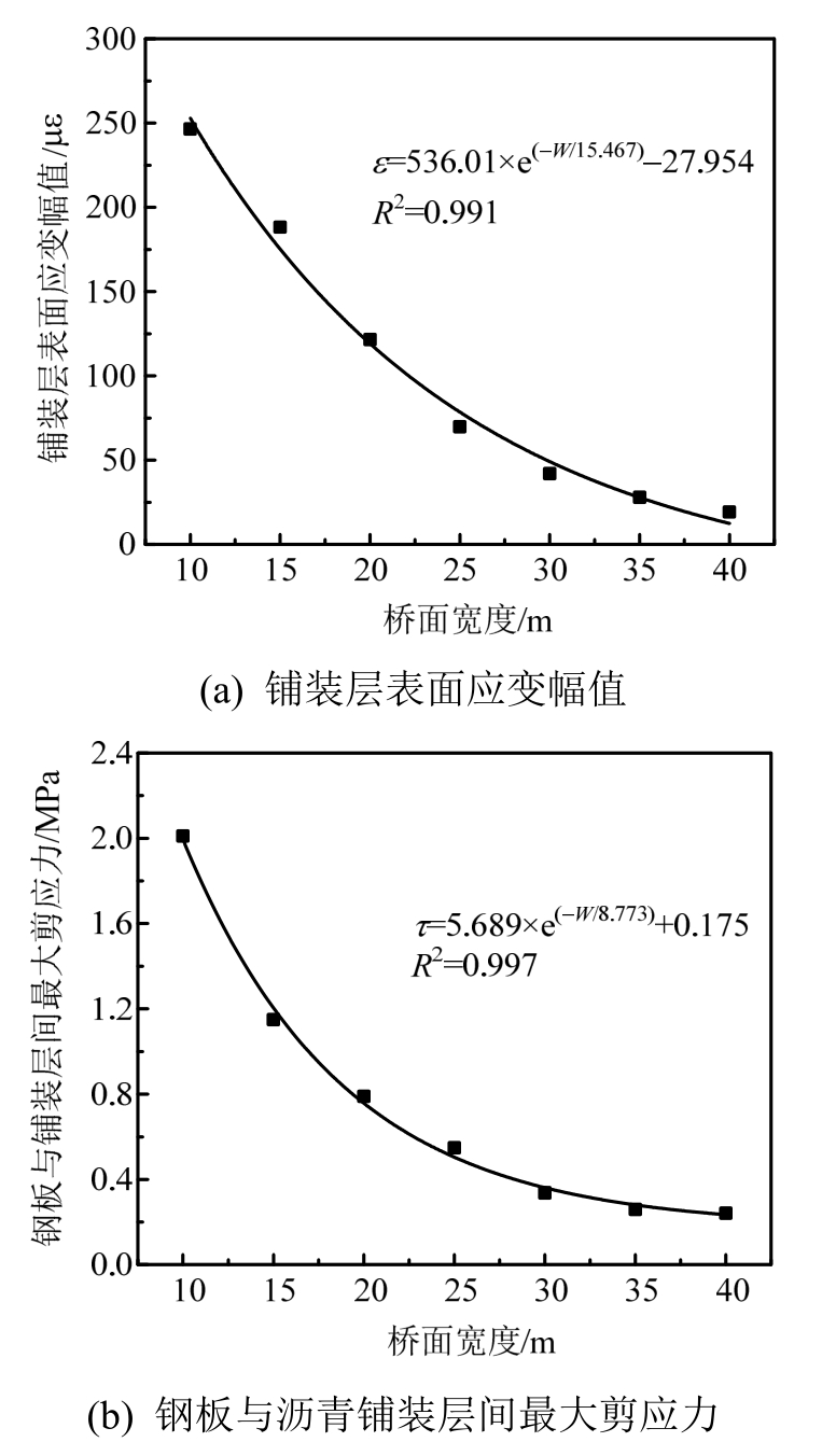 (3)桥梁跨径对铺装层表面应变幅值和铺装层与钢板间最大剪应力的影响非常大,尤其对铺装层表面应变幅值的影响更为显著。桥面宽度由10 m增加到40 m时,铺装层表面应变幅值和铺装层与钢板间最大剪应力均呈指数函数逐渐减小,前者减小幅度为92.2%,后者减小幅度为88%。