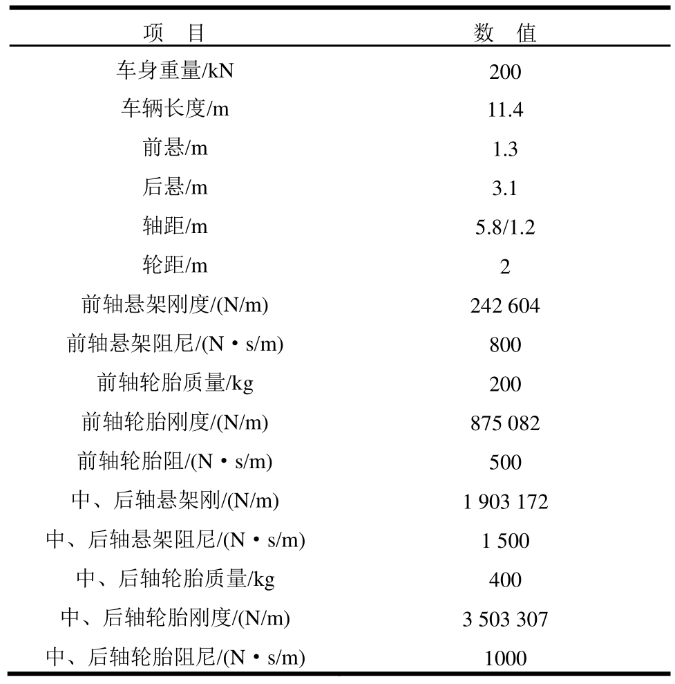 项 目 数 值车身重量/kN 200车辆长度/m 11.4前悬/m 1.3后悬/m 3.1轴距/m 5.8/1.2轮距/m 2前轴悬架刚度/(N/m) 242 604前轴悬架阻尼/(N·s/m) 800前轴轮胎质量/kg 200前轴轮胎刚度/(N/m) 875 082前轴轮胎阻/(N·s/m) 500中、后轴悬架刚/(N/m) 1 903 172中、后轴悬架阻尼/(N·s/m) 1 500中、后轴轮胎质量/kg 400中、后轴轮胎刚度/(N/m) 3 503 307中、后轴轮胎阻尼/(N·s/m) 1000