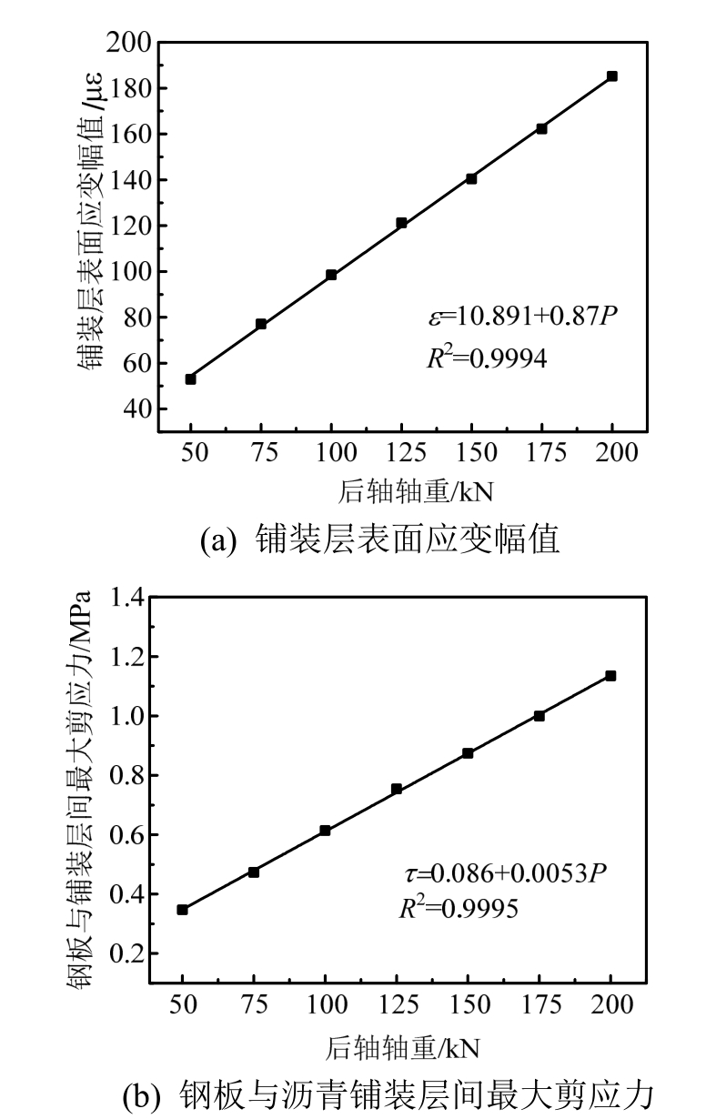 Fig.6 Influences of rear axis load on surface strain amplitude of pavement and maximum shear stress between bridge deck pavement and steel plate