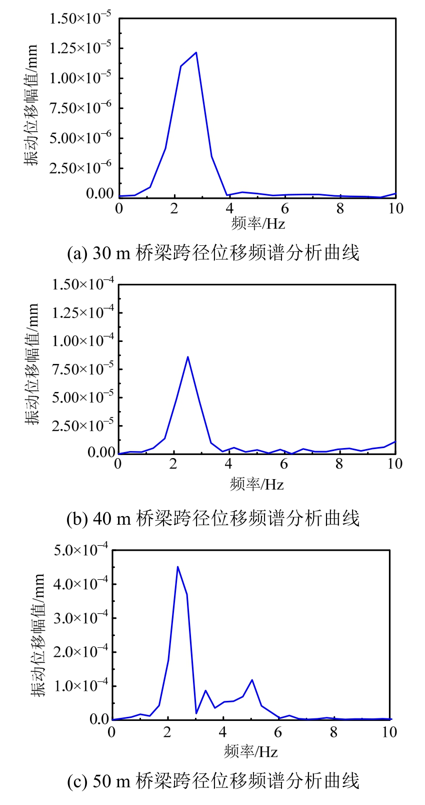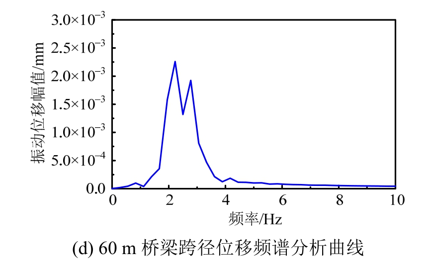 图9 不同跨径的位移频谱曲线