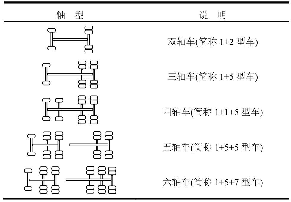 轴 型 说 明双轴车(简称1+2型车)三轴车(简称1+5型车)四轴车(简称1+1+5型车)五轴车(简称1+5+5型车)六轴车(简称1+5+7型车)