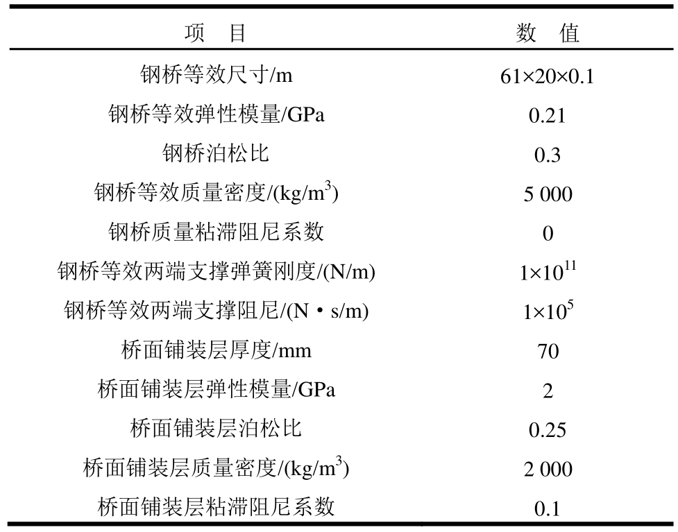 项 目 数 值钢桥等效尺寸/m 61×20×0.1钢桥等效弹性模量/GPa 0.21钢桥泊松比 0.3钢桥等效质量密度/(kg/m3) 5 000钢桥质量粘滞阻尼系数 0钢桥等效两端支撑弹簧刚度/(N/m) 1×1011钢桥等效两端支撑阻尼/(N·s/m) 1×105桥面铺装层厚度/mm 70桥面铺装层弹性模量/GPa 2桥面铺装层泊松比 0.25桥面铺装层质量密度/(kg/m3) 2 000桥面铺装层粘滞阻尼系数 0.1