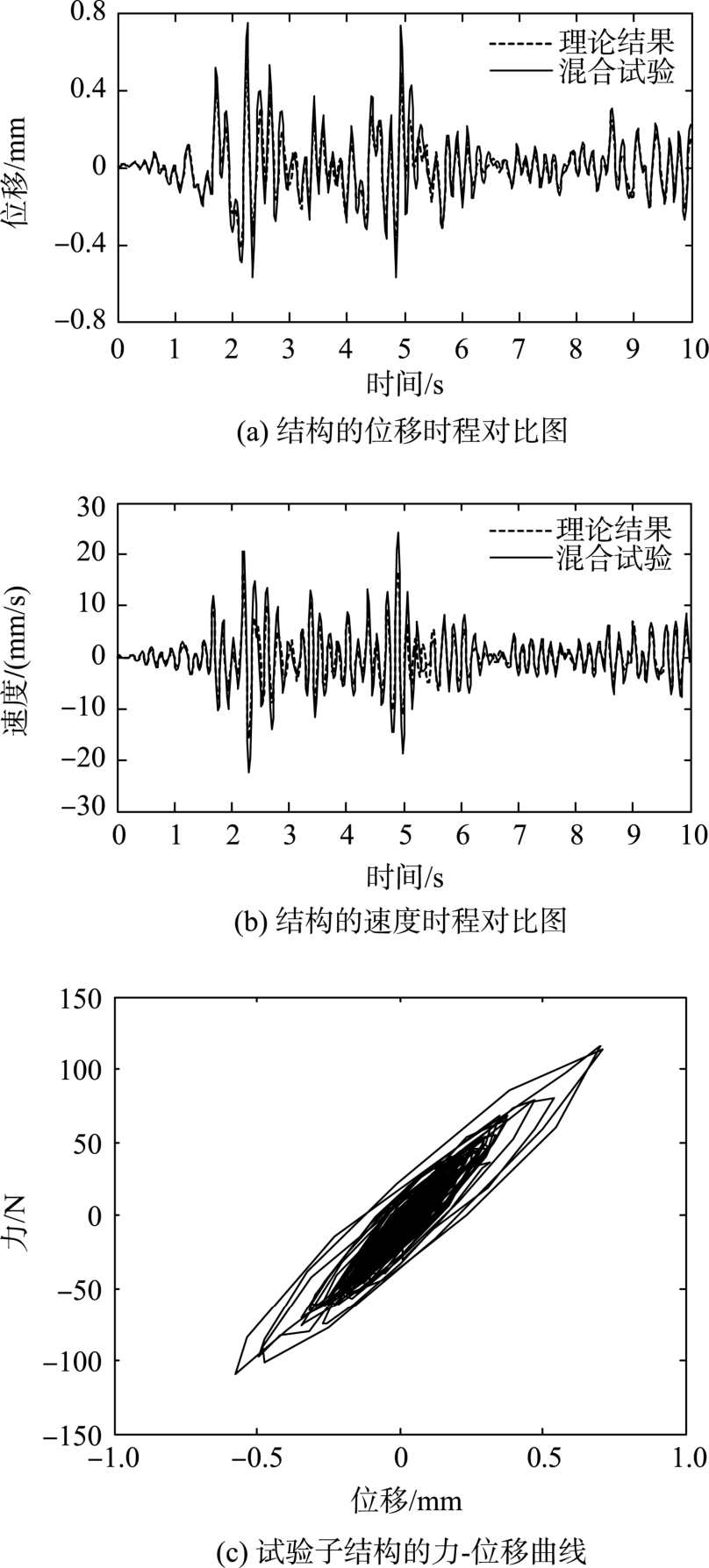 从图8(a)和图8(b)可以看出,加粘弹性阻尼器的单自由度框架结构在地震作用下的混合试验位移最大值为0.748 mm,最小值为-0.574 mm,理论解位移最大值为0.558 mm,最小值为-0.432 mm,绝对误差最大值为0.190 mm,位移误差的标准差为0.061 mm;速度最大值为24.0 mm/s,最小值为-22.4 mm/s,理论解速度最大值为16.6 mm/s,最小值为15.8 mm/s,绝对误差最大值为7.4 mm,速度误差的标准差为2.2 mm。从图8(c)可以看出,试验子结构的反力最大值为116.1 N,最小值为-102.4 N;最大位移为0.748 mm,最小位移为-0.574 mm。其力-位移曲线两端棱角分明,是由于地震作用下峰值处力与位移快速变化,同时曲线总体类似于椭圆且较为饱满,能够反映出粘弹性阻尼器耗能效果较好。由上述分析可知,混合试验要略大于理论结果,在峰值处相差比较明显,但混合试验与理论结果基本吻合。试验中误差存在的主要原因是:粘弹性阻尼器是一种非线性减震装置,特别是装置中所采用的粘弹性减震材料具有强非线性特性,其性能受到温度、激励频率和激励幅值的影响。本混合试验未能实时完成,导致试验过程中粘弹性阻尼器刚度偏小,因此试验结果会大于理论结果。此外,整个混合试验系统中所采用的PID控制器的参数一经整定后,在整个试验过程中就固定不变,这样便可保证大部分激励下的控制要求。然而PID参数不随着负载非线性特性的变化而进行实时调整,使得在试验过程中的个别峰值处不能达到最佳的控制效果,而出现了一定误差。从试验结果可以看出,整个混合试验系统在El-Centro波作用下,混合试验与理论结果基本保持一致,且误差的标准差较小,说明了混合试验解与理论解总体偏差较小,验证了本文设计的混合试验系统可行性。