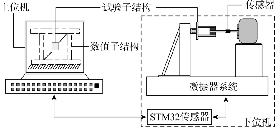 混合试验系统是以电动式激振器作为作动器(即整个系统的动力源),实现对试验子结构振动力的加载;以试验子结构为试验负载,实现在振动力加载下的力响应和位移响应,并采用力传感器与位移传感器测量;以STM32单片机为控制核心,实现上、下位机的数据通信,传感器的数据采集以及采用PID控制算法对激振器驱动控制;以MATLAB软件完成整个试验系统数值子结构设计,实现房屋结构数值模型的搭建,上、下位机的数据通信以及处理下位机反馈回来的力信号与位移信号;以STM32单片机的USART接口与MATLAB软件串口通信外部接口连接,实现上、下位机的串口通信,建立起数值子结构与试验子结构联系。整个混合试验系统结构框图,如图2所示。