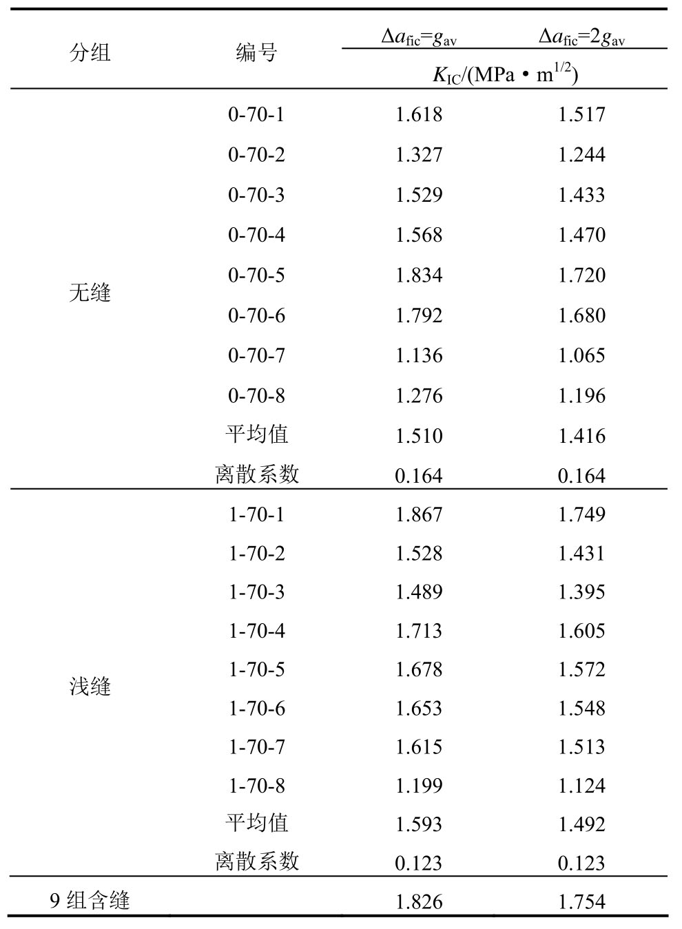 Δafic=gav Δafic=2gav分组 编号 KIC/(MPa·m1/2)0-70-1 1.618 1.517无缝0-70-2 1.327 1.244 0-70-3 1.529 1.433 0-70-4 1.568 1.470 0-70-5 1.834 1.720 0-70-6 1.792 1.680 0-70-7 1.136 1.065 0-70-8 1.276 1.196平均值 1.510 1.416离散系数 0.164 0.164 1-70-1 1.867 1.749浅缝1-70-2 1.528 1.431 1-70-3 1.489 1.395 1-70-4 1.713 1.605 1-70-5 1.678 1.572 1-70-6 1.653 1.548 1-70-7 1.615 1.513 1-70-8 1.199 1.124平均值 1.593 1.492离散系数 0.123 0.123 9组含缝 1.826 1.754