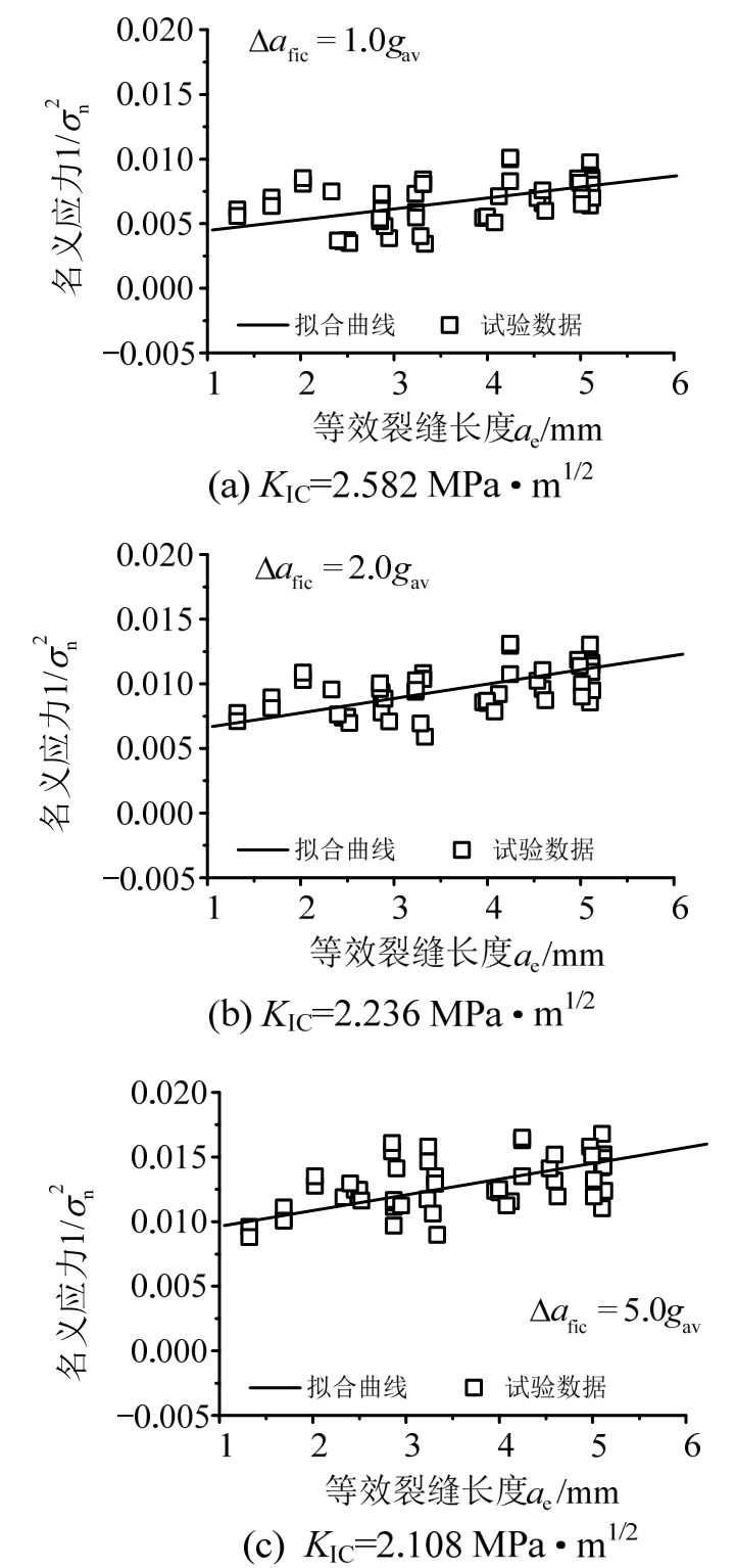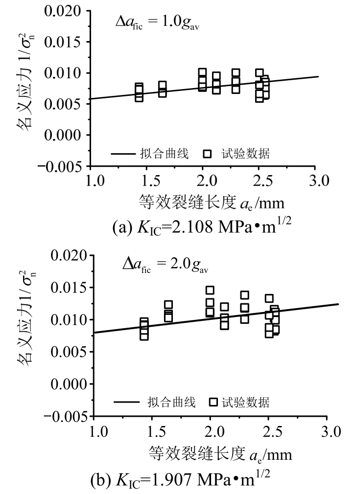 基于基本理论式(4),采用回归分析方法[21-24],由多组不同缝高比的含缝试件,可外推确定出无尺寸效应的KIC。即对一定量的试验数据(由实测Pmax确定的σn,以及含缝试件的几何形状参数ae)进行拟合来确定KIC。数据拟合情况见图4和图5,具体确定的KIC结果也列入表2。