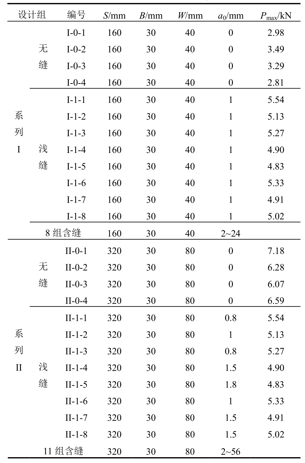 设计组 编号 S/mmB/mm W/mm a0/mm Pmax/kN I-0-1 160 30 40 0 2.98无缝I-0-2 160 30 40 0 3.49 I-0-3 160 30 40 0 3.29 I-0-4 160 30 40 0 2.81 I-1-1 160 30 40 1 5.54系列I 浅缝I-1-2 160 30 40 1 5.13 I-1-3 160 30 40 1 5.27 I-1-4 160 30 40 1 4.90 I-1-5 160 30 40 1 4.83 I-1-6 160 30 40 1 5.33 I-1-7 160 30 40 1 4.91 I-1-8 160 30 40 1 5.02 8组含缝 160 30 40 2~24 II-0-1320 30 80 0 7.18无缝II-0-2320 30 80 0 6.28 II-0-3320 30 80 0 6.07 II-0-4320 30 80 0 6.59 II-1-1320 30 80 0.8 5.54系列I I 浅缝II-1-2320 30 80 1 5.13 II-1-3320 30 80 0.8 5.27 II-1-4320 30 80 1.5 4.90 II-1-5320 30 80 1.8 4.83 II-1-6320 30 80 1 5.33 II-1-7320 30 80 1.5 4.91 II-1-8320 30 80 1.5 5.02 11组含缝 320 30 80 2~56