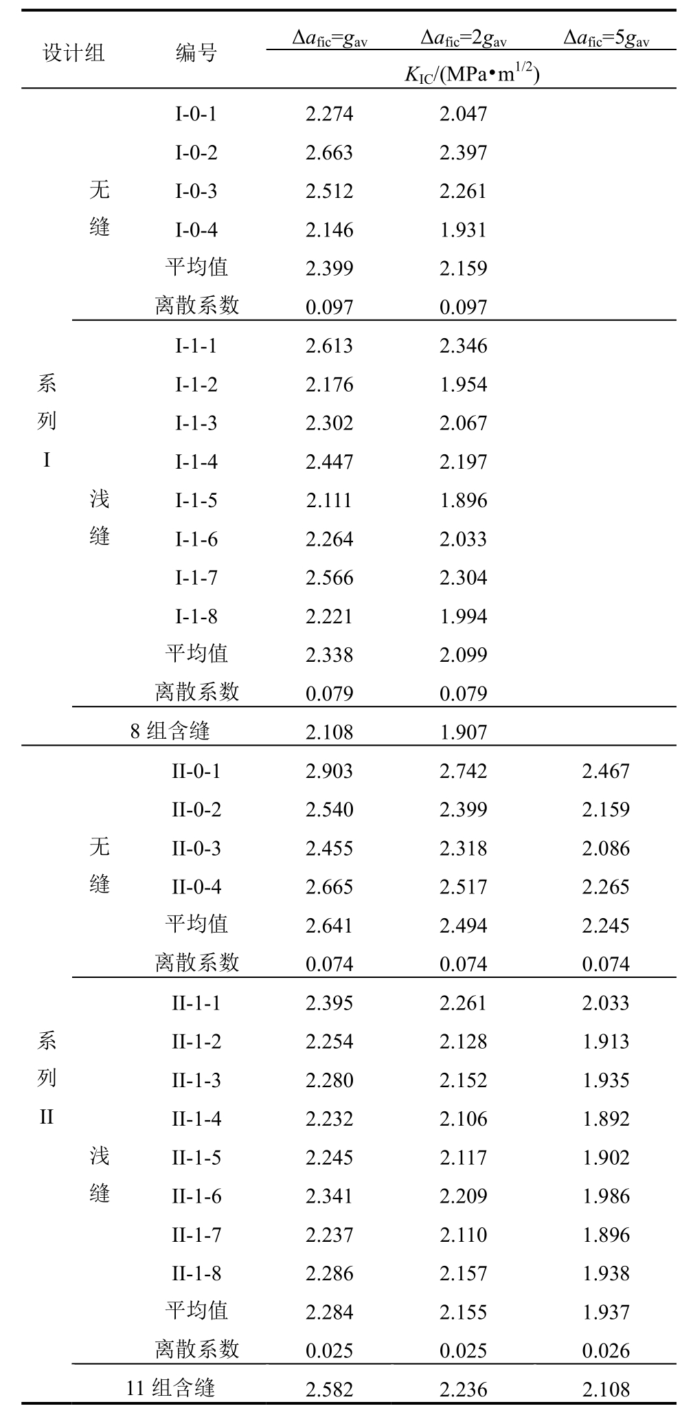 如图3所示,无缝试件裂缝出现位置随机。通过表2的比较可见,无缝试件实测试验结果及确定参数的离散性略大于浅缝试件:比如Δafic=1.0gav时,无缝试件系列I和系列II确定的KIC的离散系数分别为0.097和0.074;相应的浅缝试件确定的KIC的离散系数分别为0.079和0.025。考虑确定结果的离散性,建议由无缝试件确定断裂韧度时,采用多个或者多组试件。而若想精确控制试件裂缝的出现位置及初始扩展方向,减小试验数据的离散性,可以采用浅缝试件。