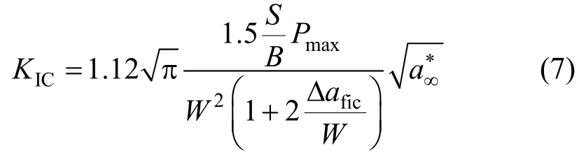 结合式(5),即可得出,由紧凑拉伸或楔入劈拉无缝试件的Pmax确定相应材料KIC的解析表达式: