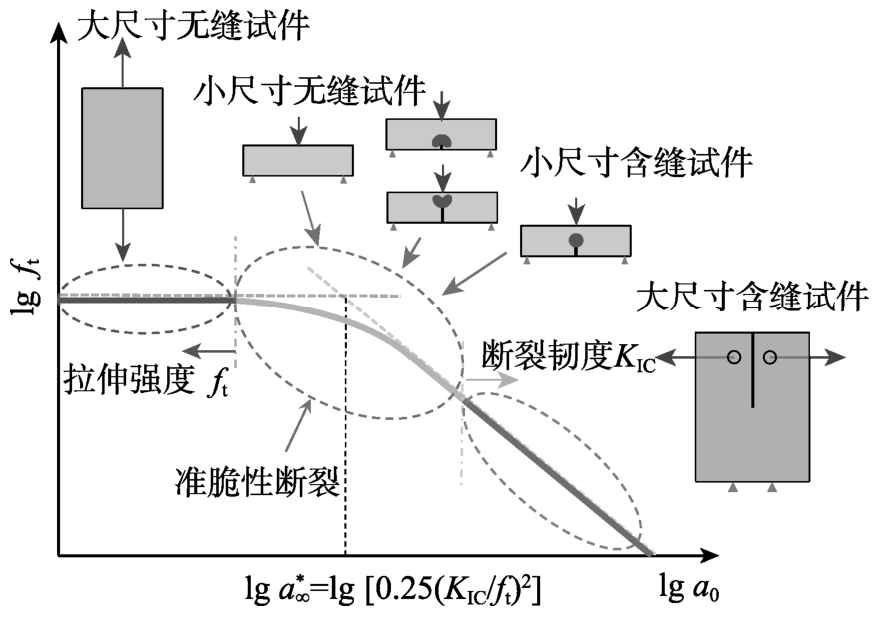 Bažant教授[26]的断裂力学理论研究表明:材料破坏时的强度与其断裂韧度有区别但也存在关联。图1阐述了强度准则、断裂韧度准则及准脆性断裂三者的联系。