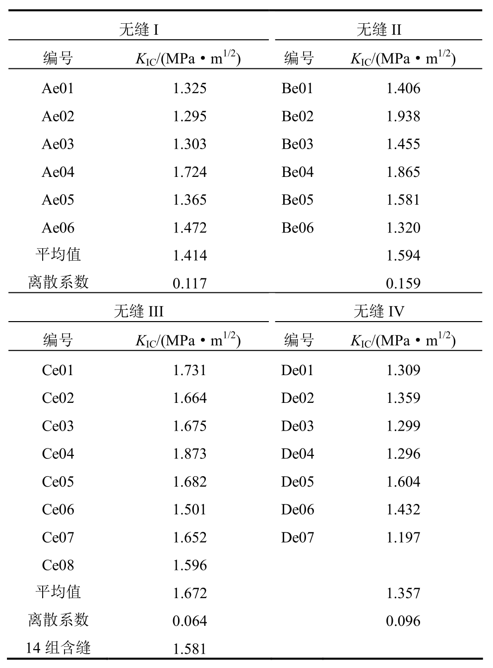无缝I 无缝II编号 KIC/(MPa·m1/2) 编号 KIC/(MPa·m1/2)Ae01 1.325 Be01 1.406 Ae02 1.295 Be02 1.938 Ae03 1.303 Be03 1.455 Ae04 1.724 Be04 1.865 Ae05 1.365 Be05 1.581 Ae06 1.472 Be06 1.320平均值 1.414 1.594离散系数 0.117 0.159无缝III 无缝IV编号 KIC/(MPa·m1/2) 编号 KIC/(MPa·m1/2)Ce01 1.731 De01 1.309 Ce02 1.664 De02 1.359 Ce03 1.675 De03 1.299 Ce04 1.873 De04 1.296 Ce05 1.682 De05 1.604 Ce06 1.501 De06 1.432 Ce07 1.652 De07 1.197 Ce08 1.596平均值 1.672 1.357离散系数 0.064 0.096 14组含缝 1.581