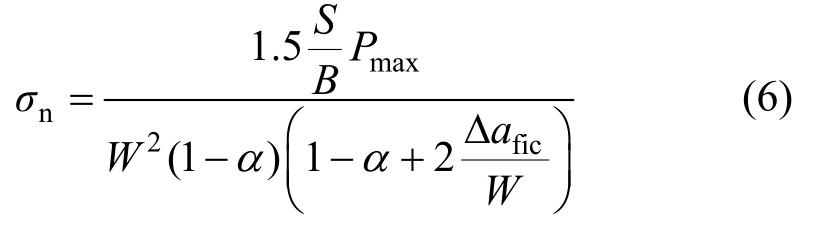 对于三点弯曲梁试件型式,考虑峰值荷载时对应的裂缝尖端虚拟裂缝扩展量Δafic,试件前、后边界以及初始裂缝长度a0等影响的名义应力σn的具体表达式为[40-42]: